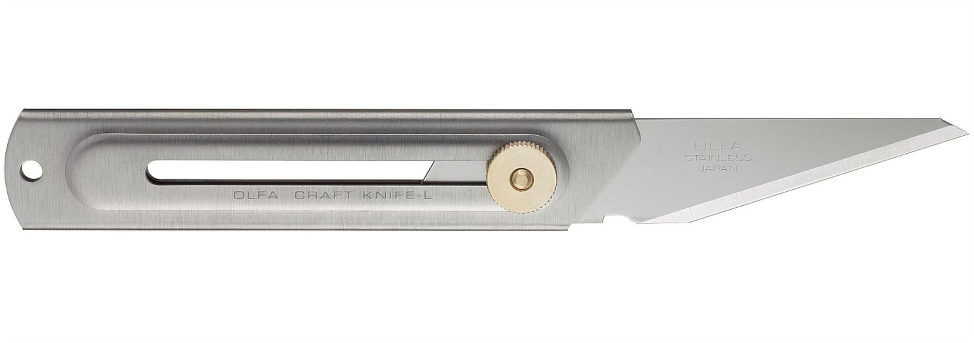 Хозяйственный нож OLFA (Олфа) OL-CK-1 с рукояткой из нержавеющей стали, снабженный сменным убирающимся лезвием и винтовым фиксатором для крепления лезвия. Данный нож незаменим в домашнем хозяйстве, в мастерской, на рыбалке, в туристических походах, используется для разрезания обоев, пленок, картона, срезания монтажной пены, для резьбы по дереву, заточки карандашей и других хозяйственных работ. Отверстие в корпусе служит для подвешивания ножа на шнурок.