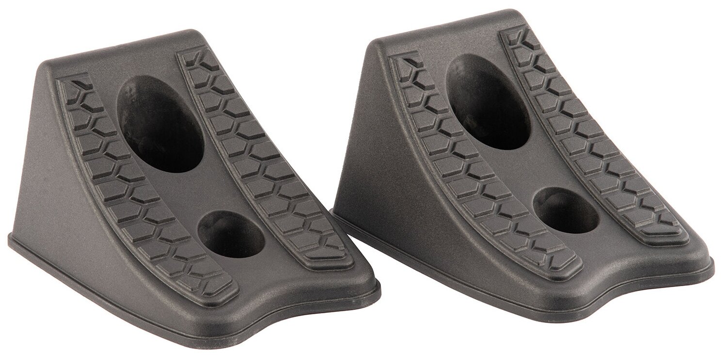 Противооткатные башмаки Matrix поставляются в комплекте из 2 штук, и предназначены для установки под колеса легкового автомобиля или прицепа. Башмаки, или упоры, не дают транспортному средству скатиться со склона или сместиться во время подъема на домкрате. Они пригодятся автовладельцам, а также будут полезны мастерам по ремонту авто. Преимущества Упоры, изготовленные из пластика, не боятся осадков и легко чистятся. Рифленая поверхность обеспечивает упорам надежное сцепление с колесами. У автомобильных башмаков имеются отверстия в корпусе, благодаря которым их можно закрепить на поверхности и использовать для ограничения въезда на парковочное место.