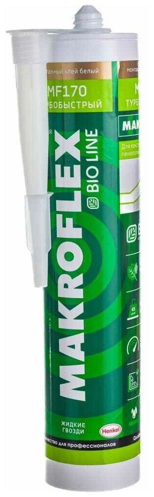 Ультрабыстрый монтажный клей MAKROFLEX MF170 турбобыстрый применяется для склеивания панелей из стиропора, пластмасс и других материалов, включая потолочные материалы и декоративные элементы из дерева. Склеиваемые материалы включают стиропор, пенопласт, полистирол, дерево, ПВХ, керамику, ДВП, гипсокартон, пробку, гипс и другие подобные материалы.