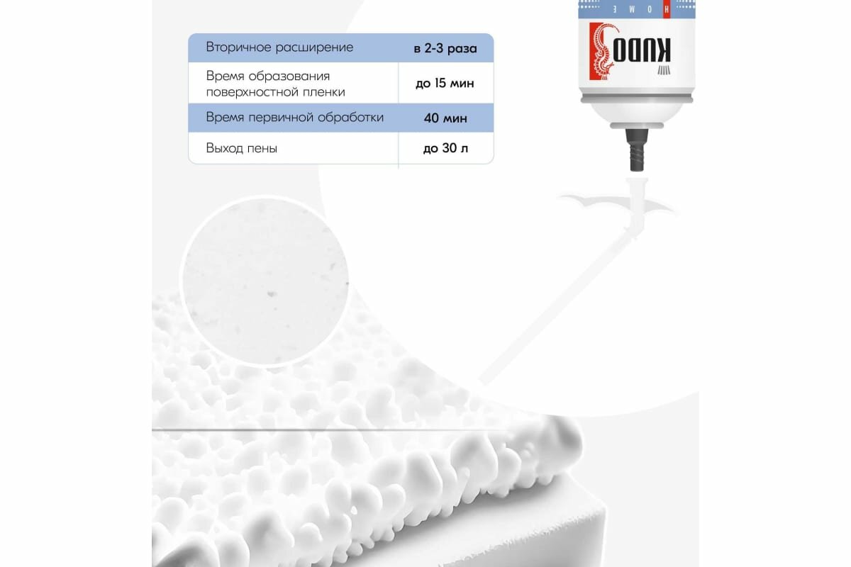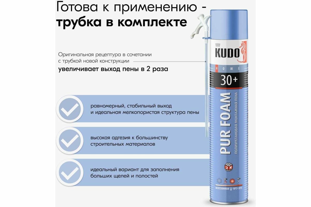 KUDO Home 30+ Всесезонная - это высококачественная однокомпонентная полиуретановая монтажная пена, которая обладает высокой адгезией к большинству строительных материалов, таких как бетон, кирпич, штукатурка, дерево, пластик. Применяется для установки оконных и дверных блоков, подоконников, крепления стеновых панелей, герметизации щелей, пустот, тепло-- и шумоизоляции швов, а также для других строительных и отделочных работ.