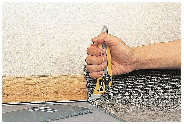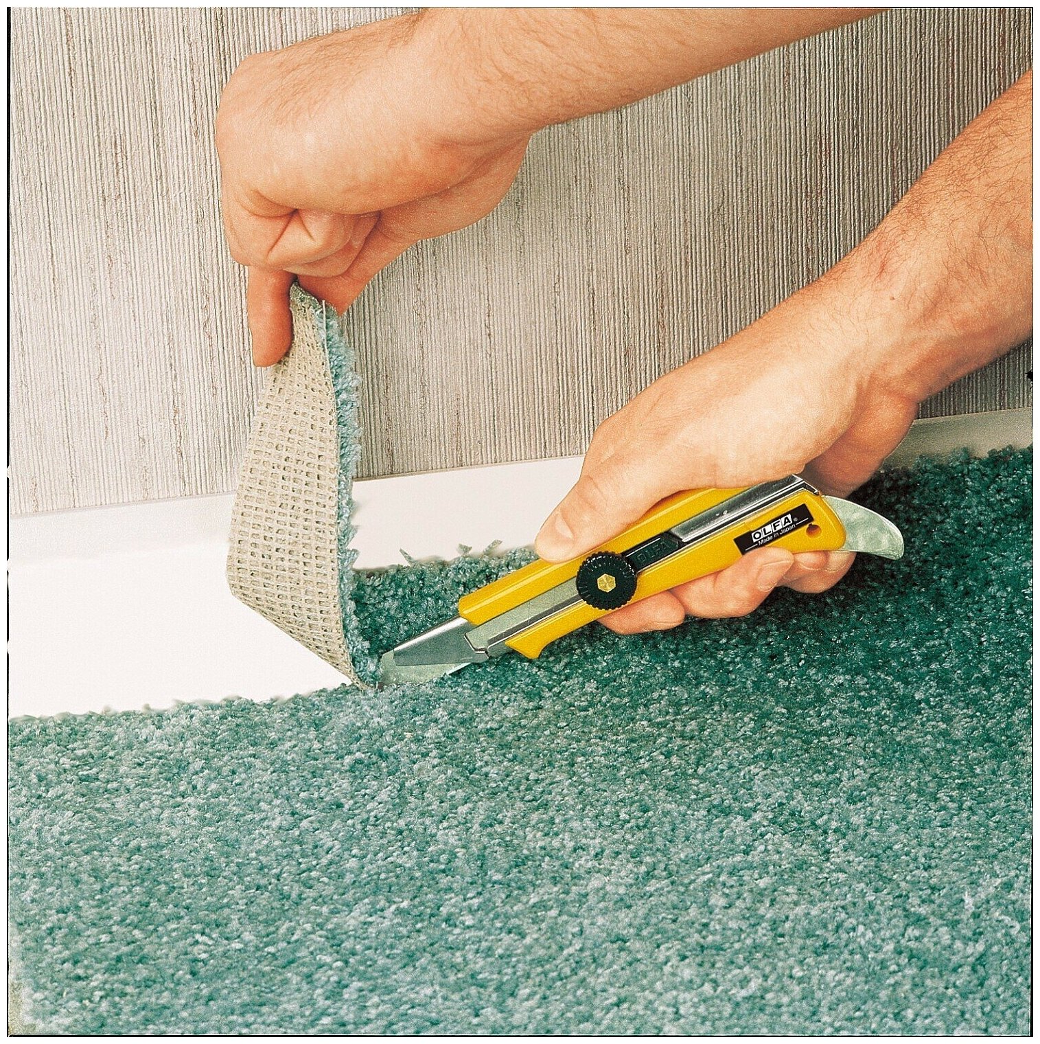 Высокопрочный нож OLFA OL с сегментированным лезвием, оснащен широкой направляющей для лезвия и специальным выступом на рукоятке для заправки коврового покрытия под планку и для снятия фиксирующих ковер скоб. Совместим с лезвиями шириной 18 мм.