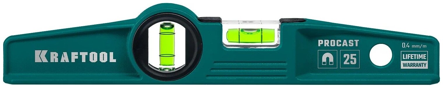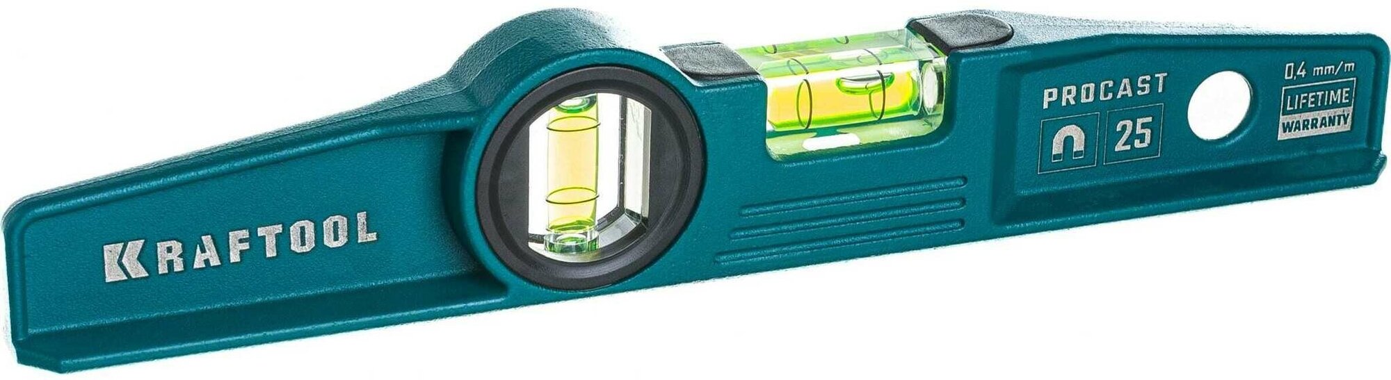 Литой уровень KRAFTOOL ''SUPERKRAFT-M'' с прочным, стойким к изгибам, тавровым корпусом из алюминиевого сплава. Уровень KRAFTOOL оборудован двумя ударопрочными, полиакриловыми ампулами и специальными магнитами для работы с металлическими конструкциями. Инструмент предназначен для проверки вертикальных и горизонтальных поверхностей.