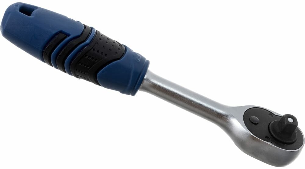 Трещоточная рукоятка прямая КОБАЛЬТ предназначена для завинчивания/отвинчивания резьбового крепежа с помощью головок с приводным квадратом 1/4". Механическая часть изготовлена из хром-ванадиевой стали, имеет надежный храповой механизм 72 зуба, с одноступенчатым зацеплением большой площади. Наиболее хорошо подходит для работы в доступных местах, с минимальным углом поворота 15. Эргономичная двухкомпонентная (резина/пластик) рукоятка повышает комфортность работы. Прямая форма рукояти позволяет наиболее хорошо передавать крутящий момент, что особенно важно при использовании в автосервисах во время ремонта различных механизмов и агрегатов, чьи крепежные элементы имеют тугое вращение. Удобная кнопка фиксации головки и флажковый переключатель направления вращения повышают скорость работы.