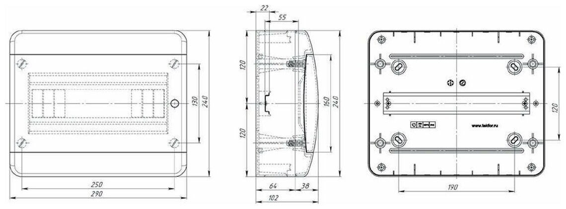 Применение Предназначены для настенного монтажа в помещениях разного назначения и используются для установки модульных устройств на DIN-рейку. Технические данные - Класс электроизоляции II - Цвет белый RAL9016 - Материал - самозатухающий термопластик, обладающий стойкостью к воспламенению при воздействии нагретой до температуры 650°С проволокой (испытание по ГОСТ 27483 (МЭК 60 695-2-1)) - Рабочие температуры от -25°С до +60°С - Межосевое расстояние между рядами 150мм - Максимальная высота модульных устройств для установки в щит 53мм - Используется размер оцинкованной DIN-рейки 35х7,5мм - Изготавливается согласно стандарта ГОСТ Р 50827 (МЭК 670) Преимущества - Выдавливаемые отверстия для подведения кабеля сбоку выполнены с внутренней стороны, что позволяет сохранить гладкой внешнюю поверхность щита. - Пластиковые быстро закручиваемые винты крышки щита. - Дверца имеет возможность установки замка для ограничения доступа в щит. - Клеммы PE/N защищены от прикосновения. - Корпус имеет четыре точки крепления к стене. Также для точного монтажа имеется разметка крепежных отверстий с задней стороны щитка. - Простое и быстрое изменение направления открытия дверцы путем переворачивания крышки. - Щиток оснащен соединяемыми кронштейнами для крепления DIN-рейки, что позволяет проводить монтаж на стенде. - На днище имеются выдавливаемые отверстия для подведения кабеля. - Крышка щитка имеет выдавливаемые элементы под модульные устройства для изменения числа устанавливаемых модулей. Комплектация - оцинкованная DIN-рейка - кронштейны для крепления DIN-рейки - две клеммные шины - держатель клеммных шин.