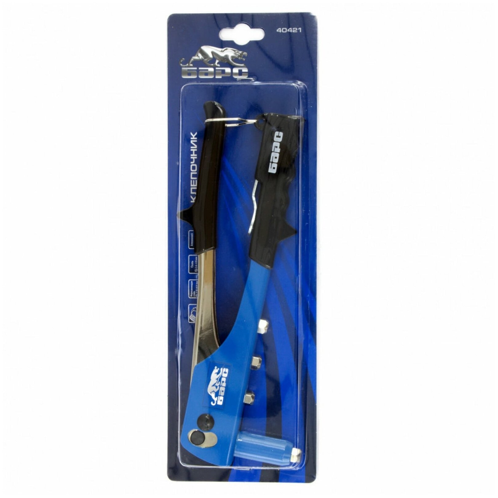 | Прочие особенности и свойства | Заклёпочник Барс 40421 длиной 250 мм предназначен для работы с вытяжными заклёпками 2,4-4,8 мм. Помогает соединять листовые металлические заготовки, металлопрофиль и легкие конструкции небольшой толщины. Он находит широкое применение как в быту, так и в профессиональной деятельности при проведении строительных, ремонтных и монтажных работ., , Преимущества, Высокое качество — заклёпочник произведен на высокотехнологичном заводе в Тайване., Долговечность и устойчивость к нагрузкам — корпус выполнен из коррозионностойкого алюминиевого сплава, а цанговый зажим — из хромомолибденовой стали (SCM435)., Эргономичные рукоятки и небольшой вес 670 г — нагрузка на руки снижена, поэтому с заклёпочником удобно работать продолжительное время., Полный комплект поставки — к инструменту прилагаются сменные головки для заклёпок из алюминия, стали и «нержавейки» диаметром 2,4-3,2-4,0-4,8 мм, а также ключ для смены насадок. |