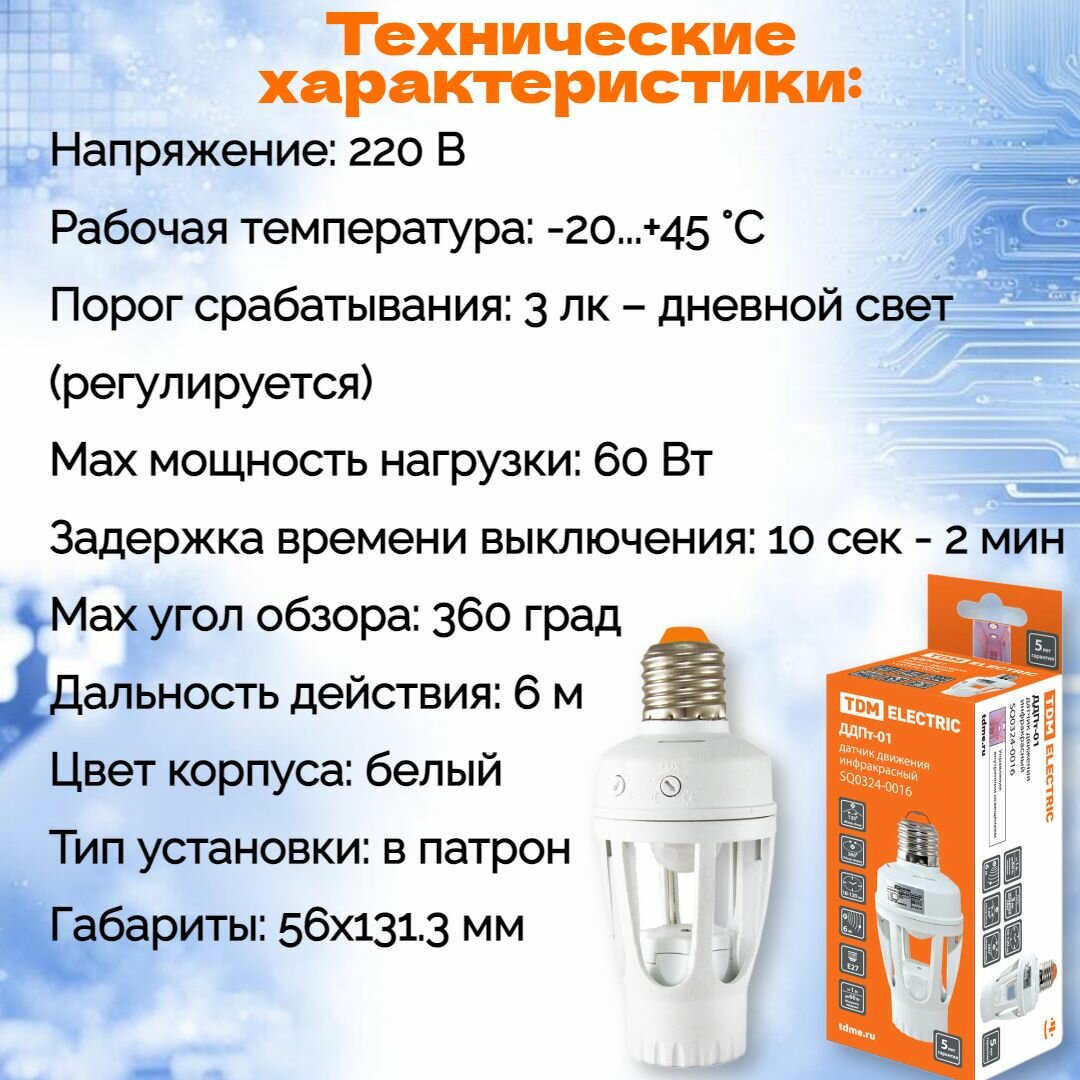 Автоматизируют процесс управления освещением.Позволяют экономить электроэнергию.Создают комфорт.Минимальная коммутируемая нагрузка от 1 Вт, что позволяет использовать все датчики, кроме ДДВ-03, с маломощными светодиодными лампами и светильниками.Датчик ДДПт-01 не требует дополнительных электрических подключений, устанавливается в патрон Е27 и питается от него.Пластик, не поддерживающий горение.Управление уличным и внутренним освещением, электроприборами, устройствами сигнализации и др.