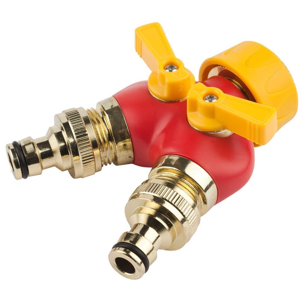 Быстросъемные аксессуары для поливочных систем, выполненные из латуни, гарантируют максимально прочное и надежное соединение без протечек. Уплотнительные кольца всех изделий изготовлены из EPDM-резины повышенной эластичности, обеспечивающей устойчивость к температурным и химическим воздействием. Применяется для одновременного подключения двух водозаборных линий к водопроводной трубе или крану внешней резьбой 3/4" или 1".