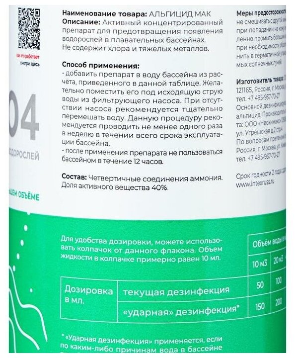 Альгицид применяется для устранения и предотвращения роста водорослей. Жидкость для бассейна против цветения воды добавляют и в воду, и также используют после очистки бассейна: для предотвращения роста водорослей можно опрыскать швы и углы 1%-м водным раствором препарата Альгицид. Также данное средство используется и для обработки душевых кабин и обходных дорожек. Препарат не содержит хлор!