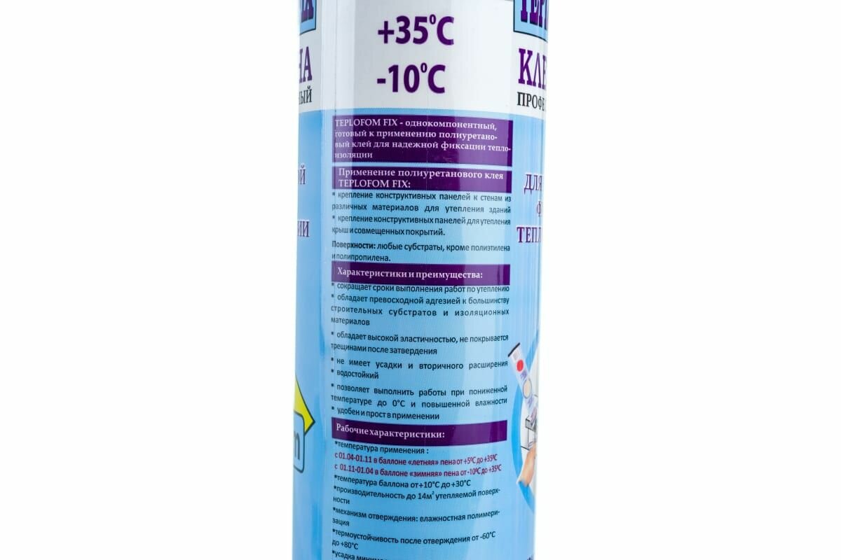 Teplofom Fix - это профессиональный полиуретановый клей в аэрозоле для крепления теплоизоляционных плит, декоративных и конструктивных панелей, гипсокартона, дерева, металла, пластика ко всем типичным строительным основаниям снаружи и внутри помещения. Обладает хорошей устойчивостью к влажности, плесени, старению, отличной адгезией к большинству строительных материалов, в том числе и к влажным.