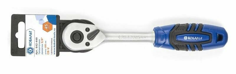 Трещоточная рукоятка прямая КОБАЛЬТ предназначена для завинчивания/отвинчивания резьбового крепежа с помощью головок с приводным квадратом 3/8". Механическая часть изготовлена из хром-ванадиевой стали, имеет надежный храповой механизм 45 зубьев, с одноступенчатым зацеплением большой площади. Наиболее хорошо подходит для работы в доступных местах, с минимальным углом поворота 15. Эргономичная двухкомпонентная (резина/пластик) рукоятка повышает комфортность работы. Прямая форма рукояти позволяет наиболее хорошо передавать крутящий момент, что особенно важно при использовании в автосервисах во время ремонта различных механизмов и агрегатов, чьи крепежные элементы имеют тугое вращение. Удобная кнопка фиксации головки и флажковый переключатель направления вращения повышают скорость работы.