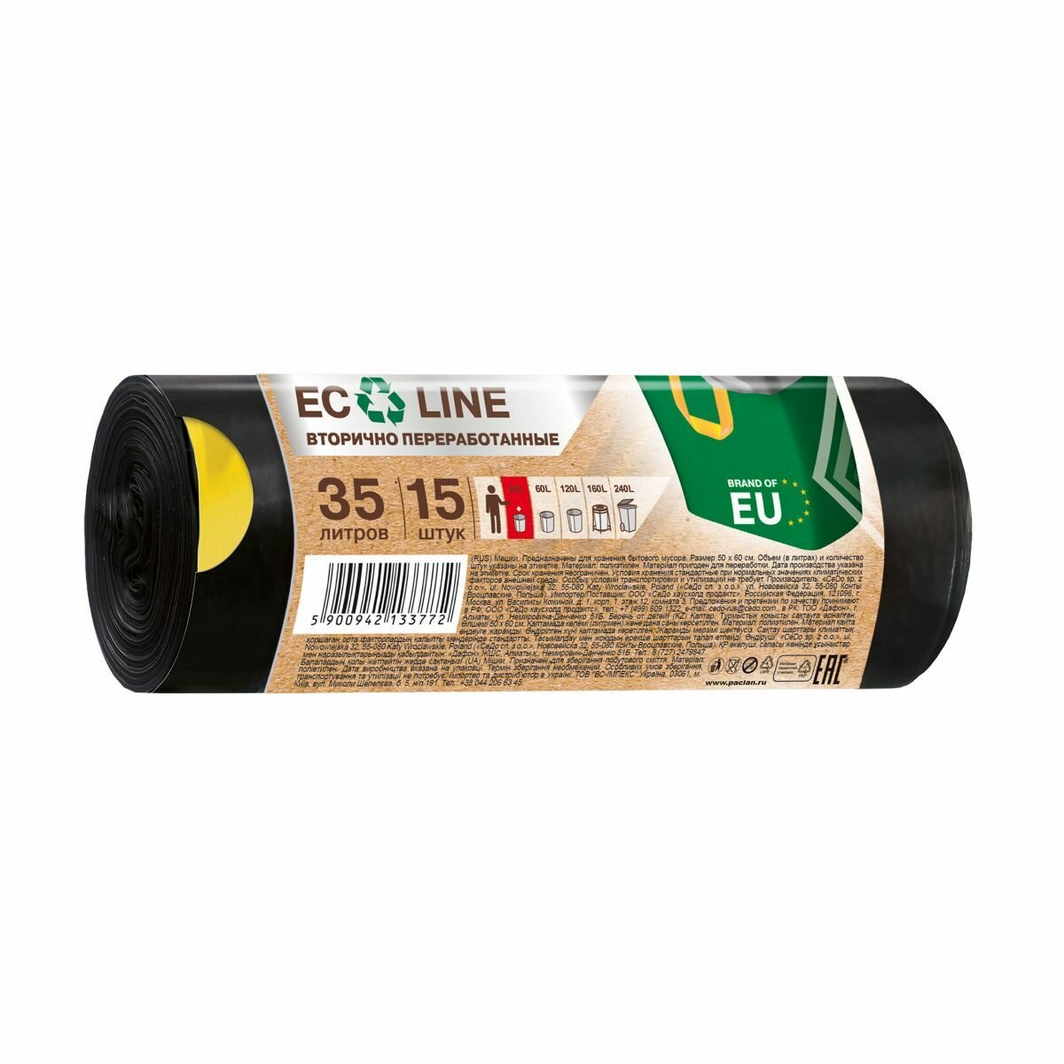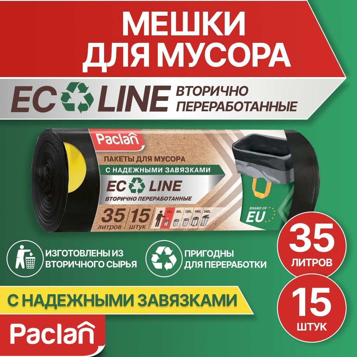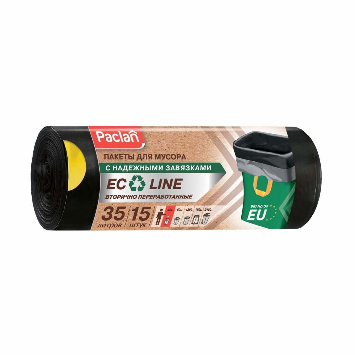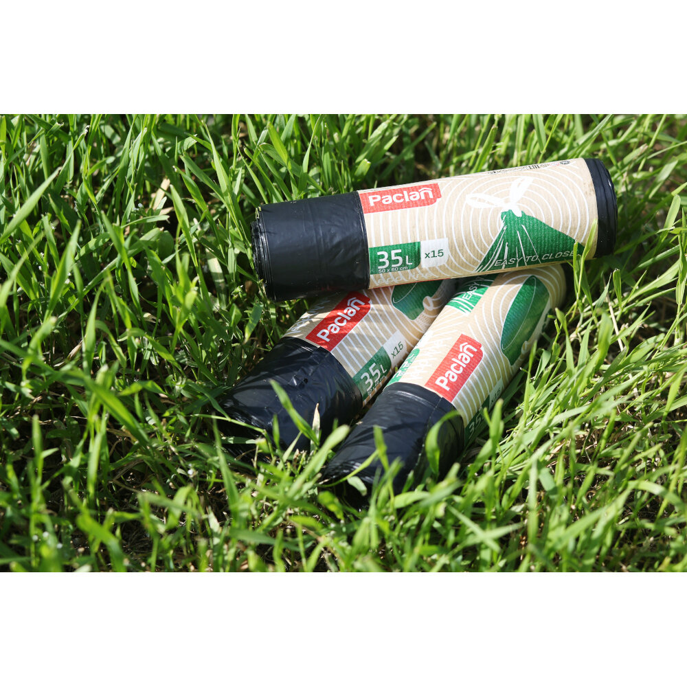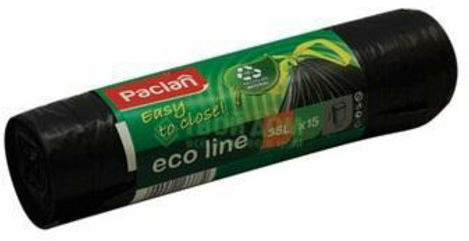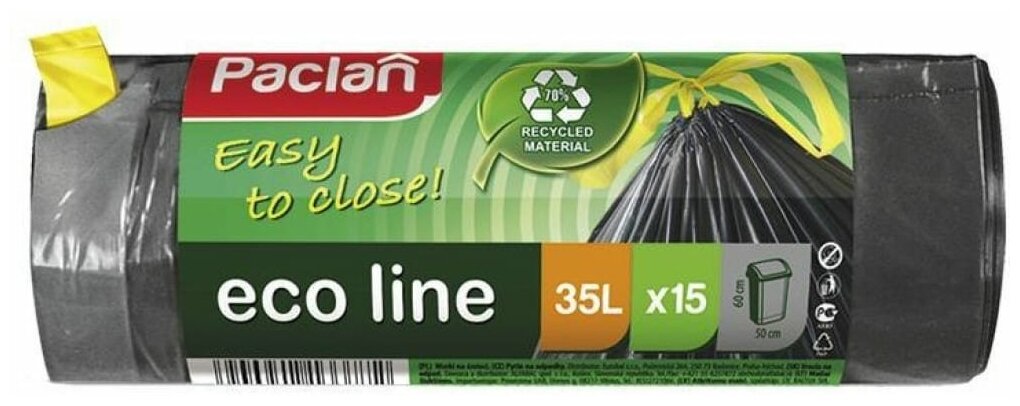 Paclan Мешки для мусора с тесьмой Eco Line 35 л 15 шт. Мешки для мусора Paclan Eco Line изготовлены по уникальной европейской технологии. По потребительским свойствам мешки Eco line не имеют аналогов на российском рынке. В состав входит 70% вторичного сырья, что позволяет сохранить окружающую экосистему и здоровье людей. Необычный крой, отсутствие донного шва создают особое удобство и надежность в использовании. Благодаря тесьме-завязке их можно легко закрыть и завязать. Пакет имеет значительную прочность, эластичную поверхность. Пакеты свернуты в плотный компактный рулон, за счет чего экономят место. Разделены качественной перфорацией, не повреждающей пакет в момент отрыва от рулона.