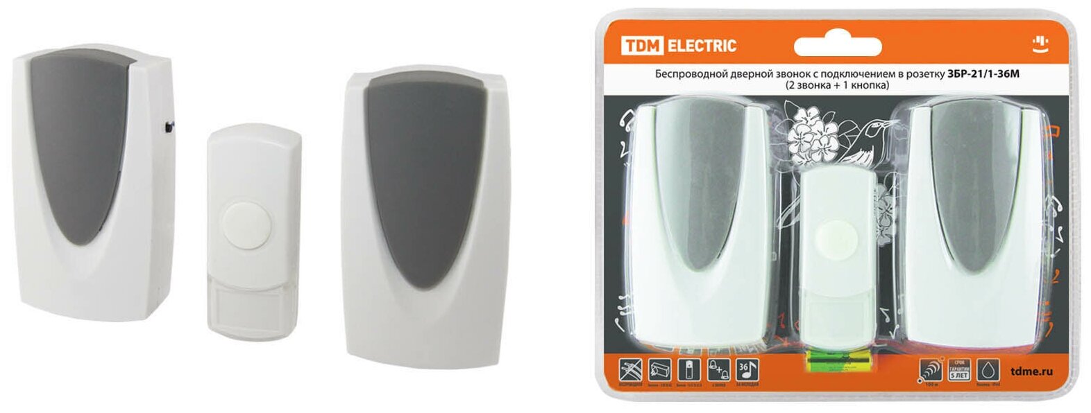 Применение Используется в качестве дверных звонков или устройств внутреннего вызова. Конструкция - Тип звонка (соединение кнопка-звонок) беспроводной. - Тип питания звонка - от электрической сети. - Модификация звонка - предустановленный код. - Кол-во звонков + кол-во кнопок - 2 звонка + 1 кнопка. - Кол-во мелодий - 36. - Степень защиты кнопки - IP44. Преимущества - Дальность работы беспроводного звонка - 100 метров (на открытом пространстве).