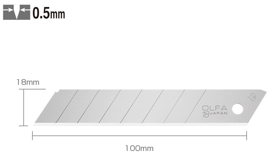 Лезвие OLFA (Олфа) - это особо прочное стальное сегментированное лезвие с двойным углом заточки. Лезвие изготовлено по уникальной технологии с ипользованием многошагового процесса доводки, имеет толщину 0.5 мм и 8 режущих сегментов и поставляется в упаковке по 50 лезвий.
