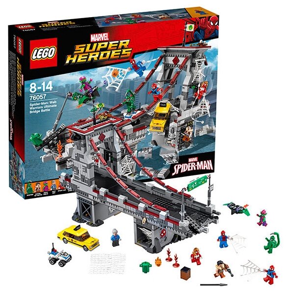 LEGO Super Heroes 76057 Человек-паук: последний бой воинов паутины - набор, который сможет заинтересовать Вашего маленького исследователя. Нешуточная борьба разгорается на огромном мосту: тетя Мэй в опасности. Только паучий союз героев способен ее спасти от коварного Крэйвена-охотника, Зеленого Гоблина и Скорпиона. Но счет идет на считанные минуты: опорную часть сооружения вот-вот поглотит водная стихия.