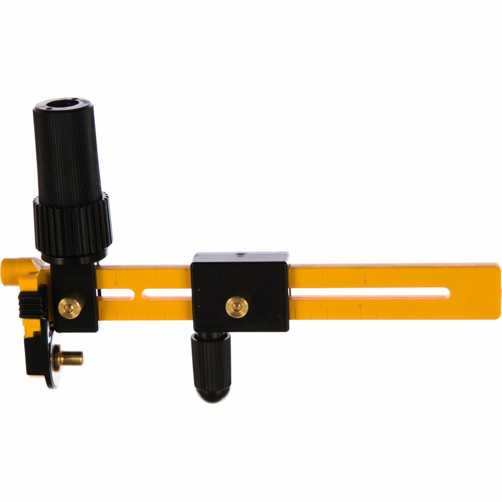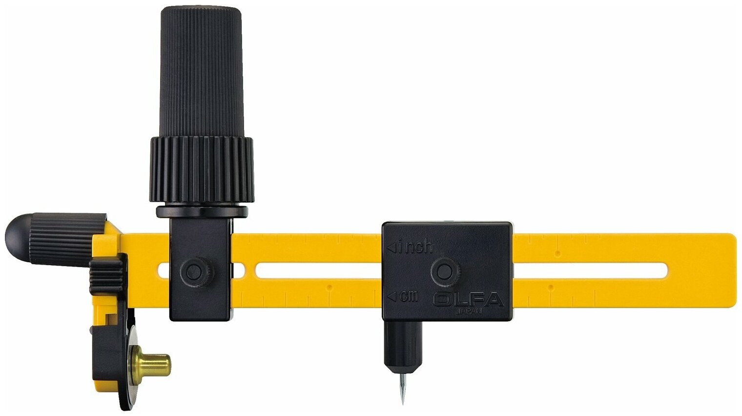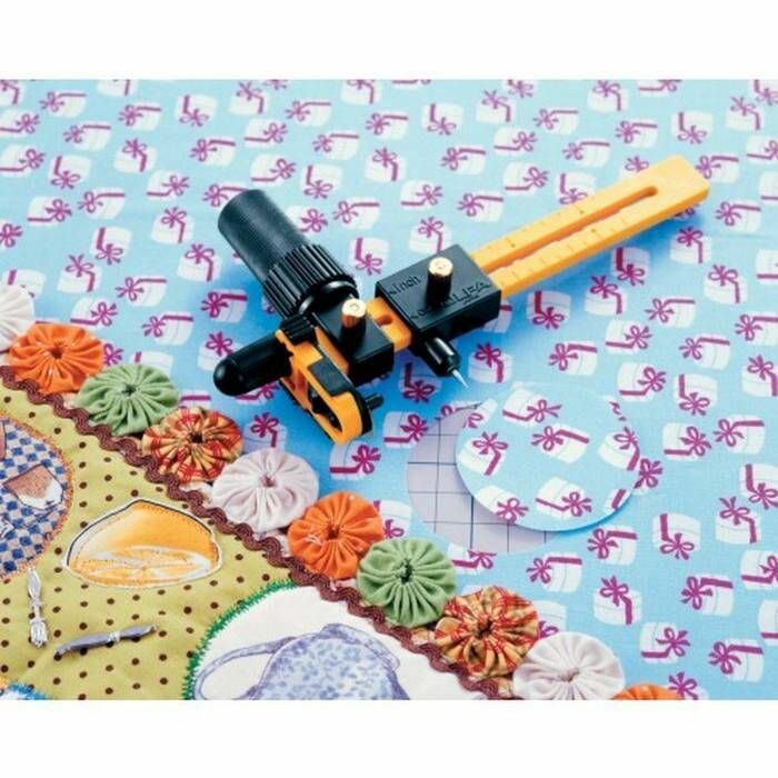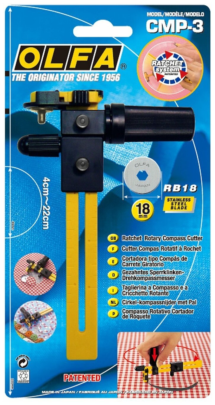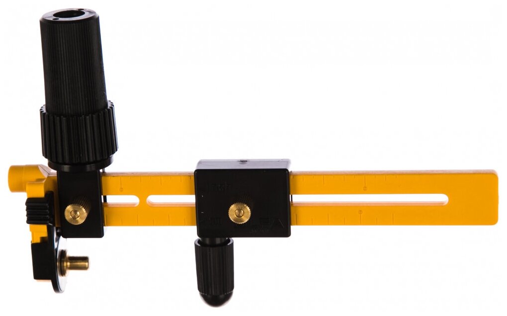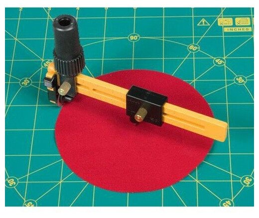 Легко настраивается и регулируется. Диаметр окружности устанавливается с помощью одной из шкал – метрической, с ценой деления 5 мм или дюймовой, с ценой деления 1/8". Положение ручки регулируется. Трещоточный механизм служит для прижима лезвия к ткани, позволяет планке с лезвием вращаться только в 1 сторону, чтобы края разрезаемой ткани были ровными.Корпус ножа изготовлен из качественного ABS-пластика. Лезвие оснащено защитным кожухом для безопасности пользователя и фиксируется с помощью цангового зажима, который обеспечивает быструю замену лезвия без использования инструментов.Нож комплектуется круговым лезвием RB18 диаметром 18 мм.