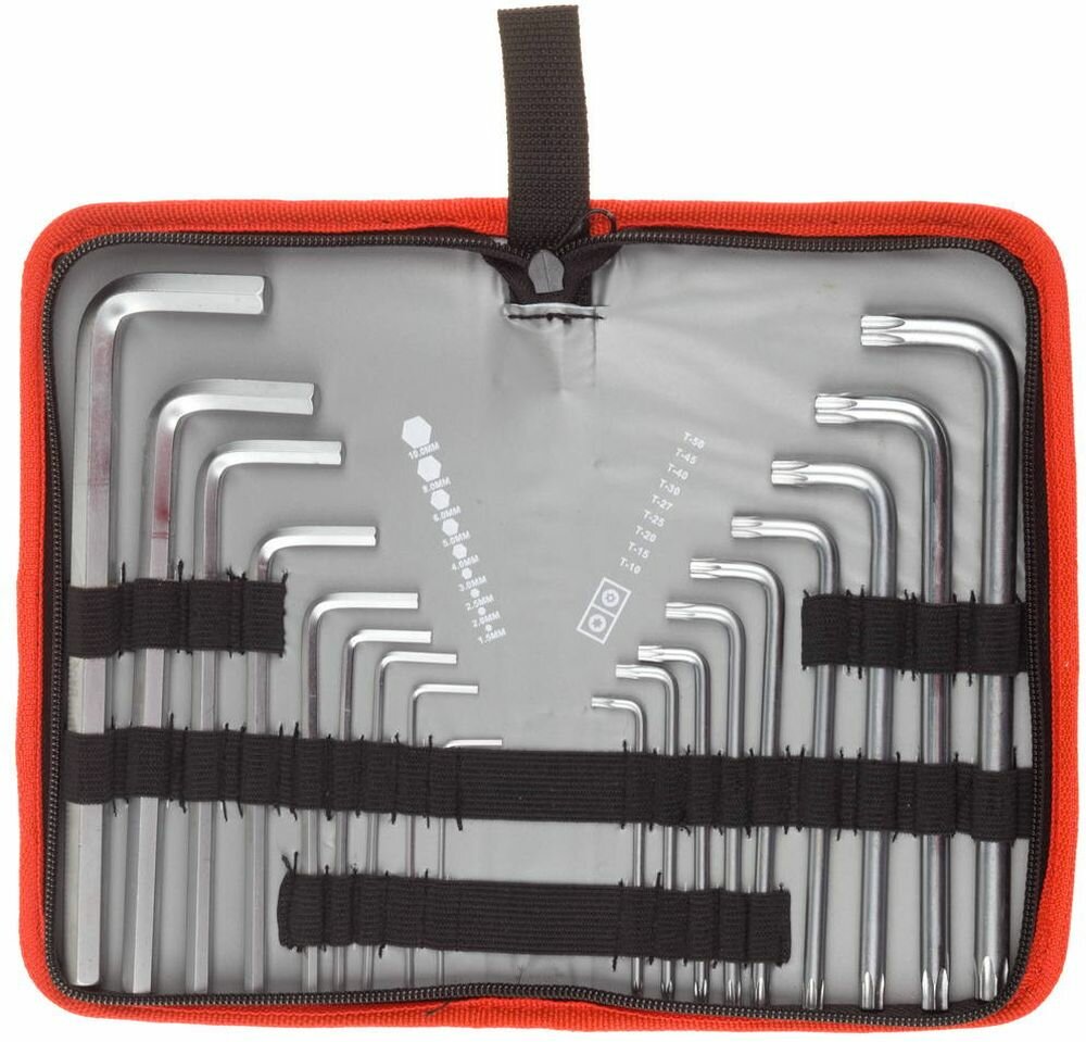Изготовлены из хромованадиевой стали, что позволяет им выдерживать длительные интенсивные нагрузки. Многоступенчатая технология обработки рабочих граней для точной посадки в крепеже. Поставляются в удобном для хранения и переноски нейлоновом чехле. Шлиц TORX HOLE позволяет работать с защищенным крепежом. Применяются при работах с крепежом, имеющим профиль в виде внутреннего шестигранного гнезда. Комплектация: Набор ключей из 18 предметов: длинные HEX 9 шт.