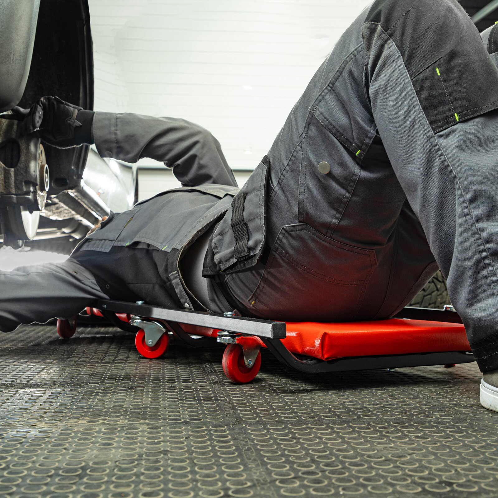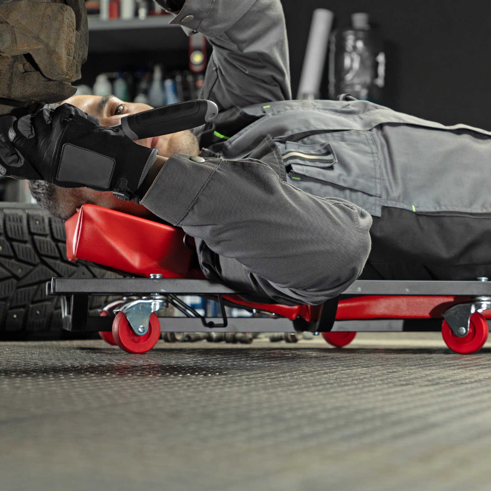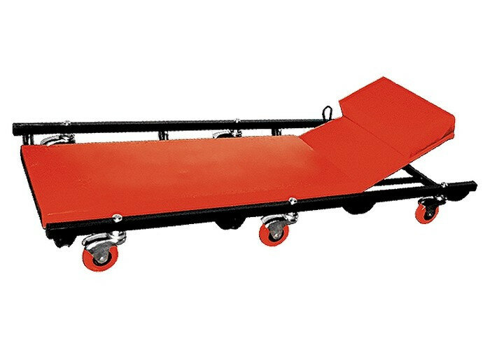 Лежак ремонтный на 6 колесах имеет металлическую основу, мягкий поролоновый матрац и поднимающийся подголовник. Обеспечивает удобство проведения ремонта трансмиссии, систем питания, выпускной системы и прочих работ.