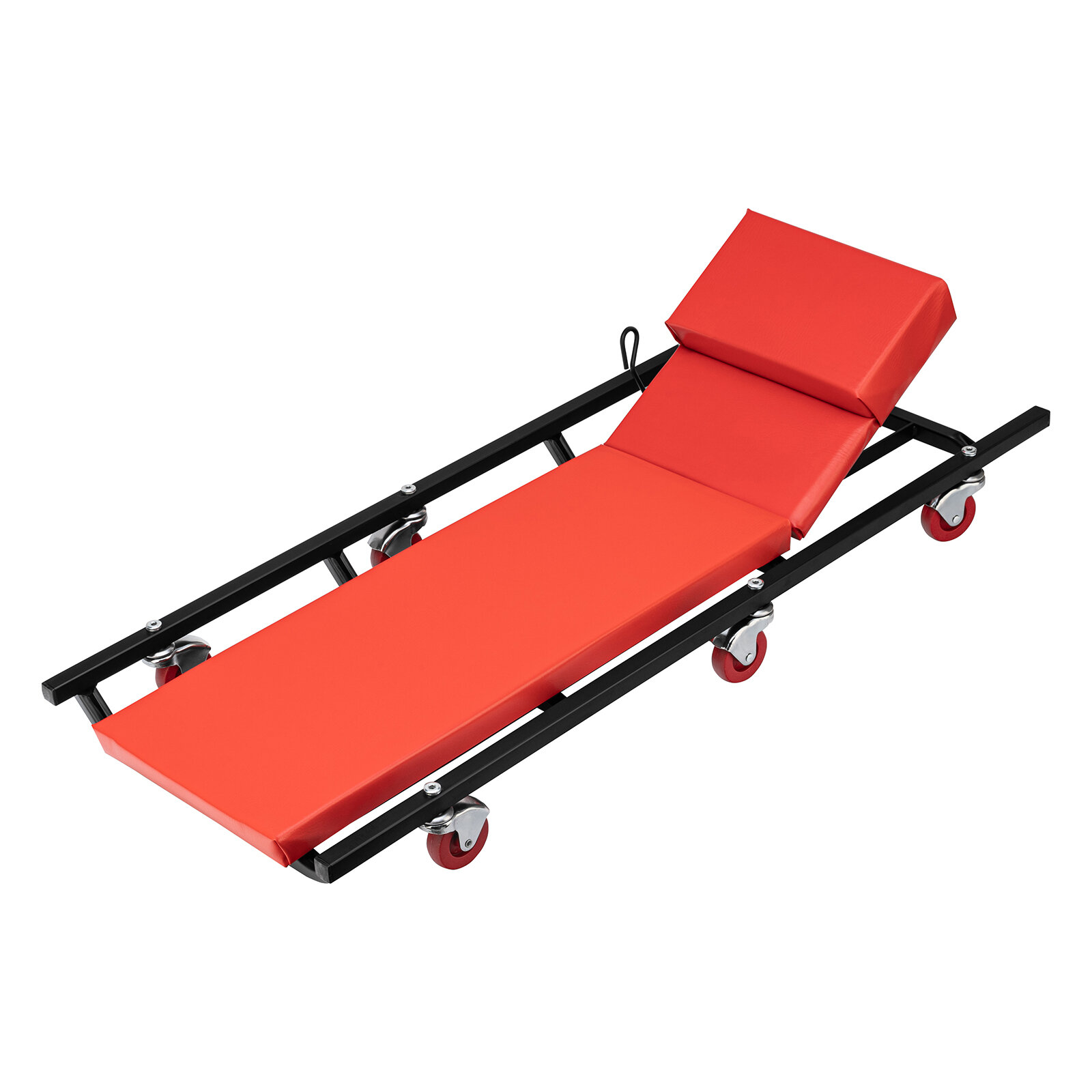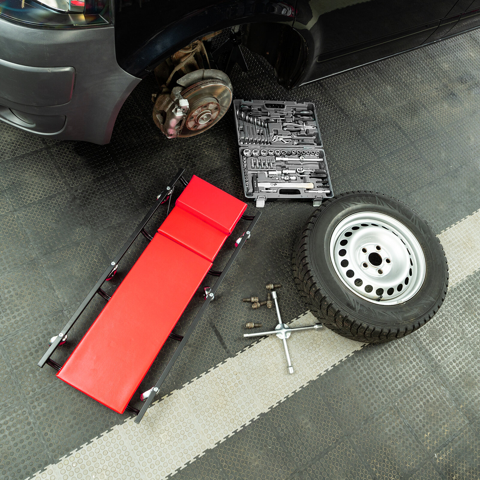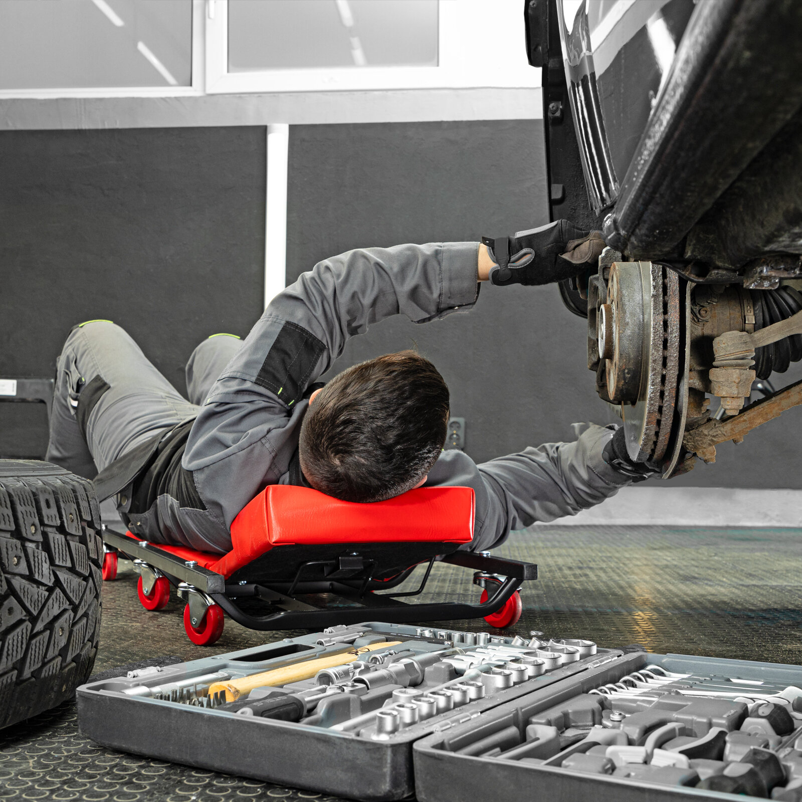 Лежак ремонтный на 6 колесах имеет металлическую основу, мягкий поролоновый матрац и поднимающийся подголовник. Обеспечивает удобство проведения ремонта трансмиссии, систем питания, выпускной системы и прочих работ.