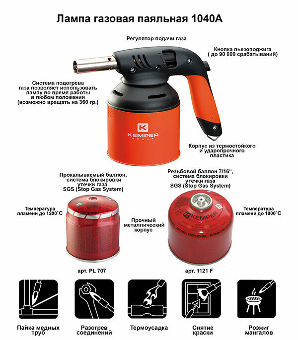 Универсальнаягазовая паяльная лампаKEMPER 1040A для прокалываемых и резьбовых баллонов. Подходит для выполнения различных видов работ, например: нагрева поверхностей для удаления старого лакокрасочного слоя, разогрева резьбовых соединений, пайки медных труб, термоусадки, розжига мангалов и т. д. Устройство оснащено системой пьезоподжига, функцией дополнительного нагрева газа, регулятором пламени, а также обеспечивает возможность подачи воздуха.Преимущества Корпус изготовлен из термостойкого пластика Оснащена системой пьезоподжига Дополнительный нагрев газа Латунная форсунка создает пламя с эффектом торнадо Регулировка пламени Функция подачи воздуха Прорезиненная рукоятка Выдвижной крючок для подвешивания и хранения Достигаемая температура: до2000 °С Максимальный расход газа: 140 гр./чВнимание! Баллон в комплект поставки не входит