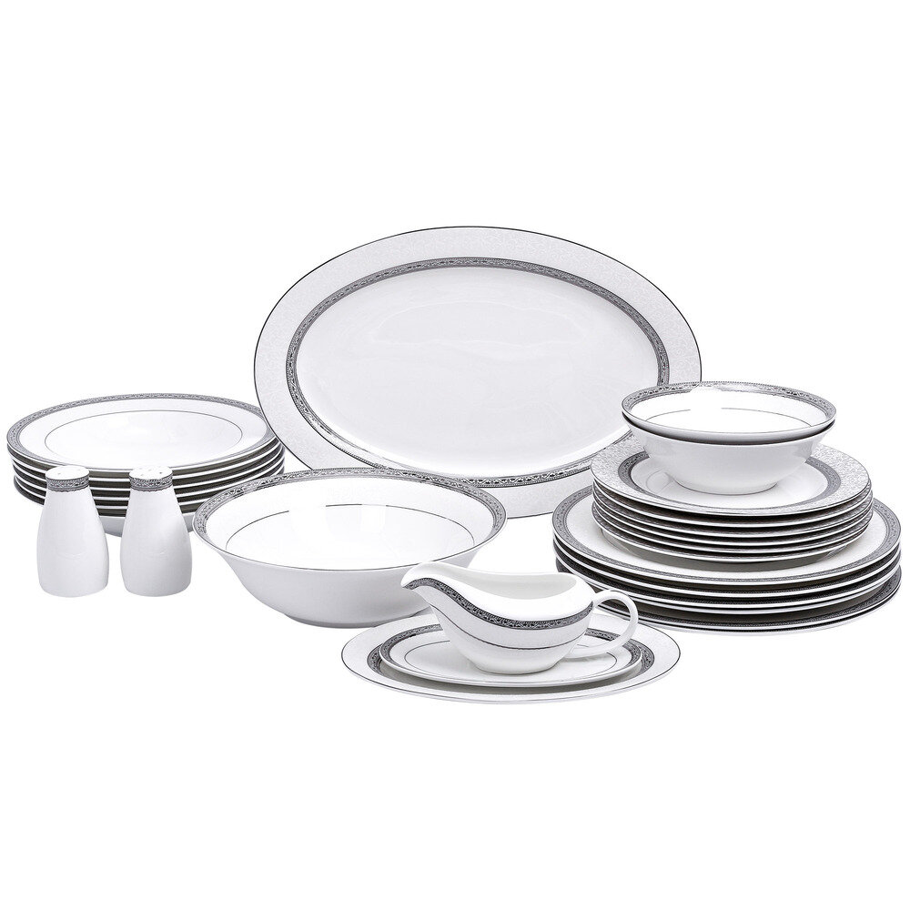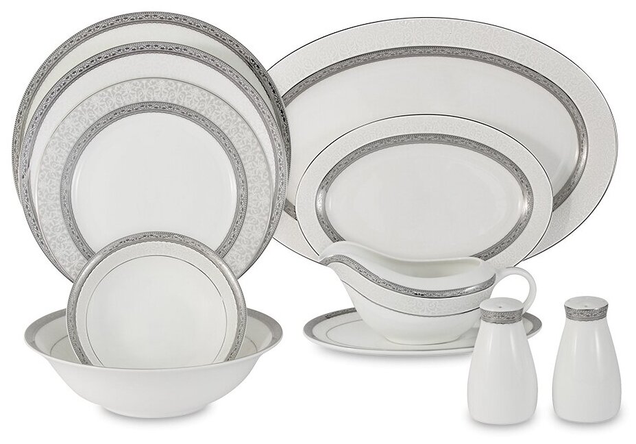 | Состав набора | 6 обеденных тарелок 26 см, 6 суповых тарелок 23,5 см, 6 закусочных тарелок 20,5 см, 1 салатник 23 см, 2 салатника 16 см, 1 блюдо 36 см, 1 блюдо 23 см, соусник с блюдом, набор для специй |