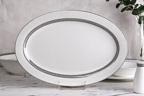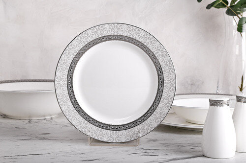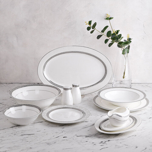 Столовый сервиз выполнен из тонкого костяного фарфора и покрыт глазурью. Одним из важных достоинств этого материала является его поразительная способность сохранять тепло подаваемых продуктов. Характеризующаяся удивительной легкостью и прозрачностью, эта посуда символизирует роскошь и комфорт.