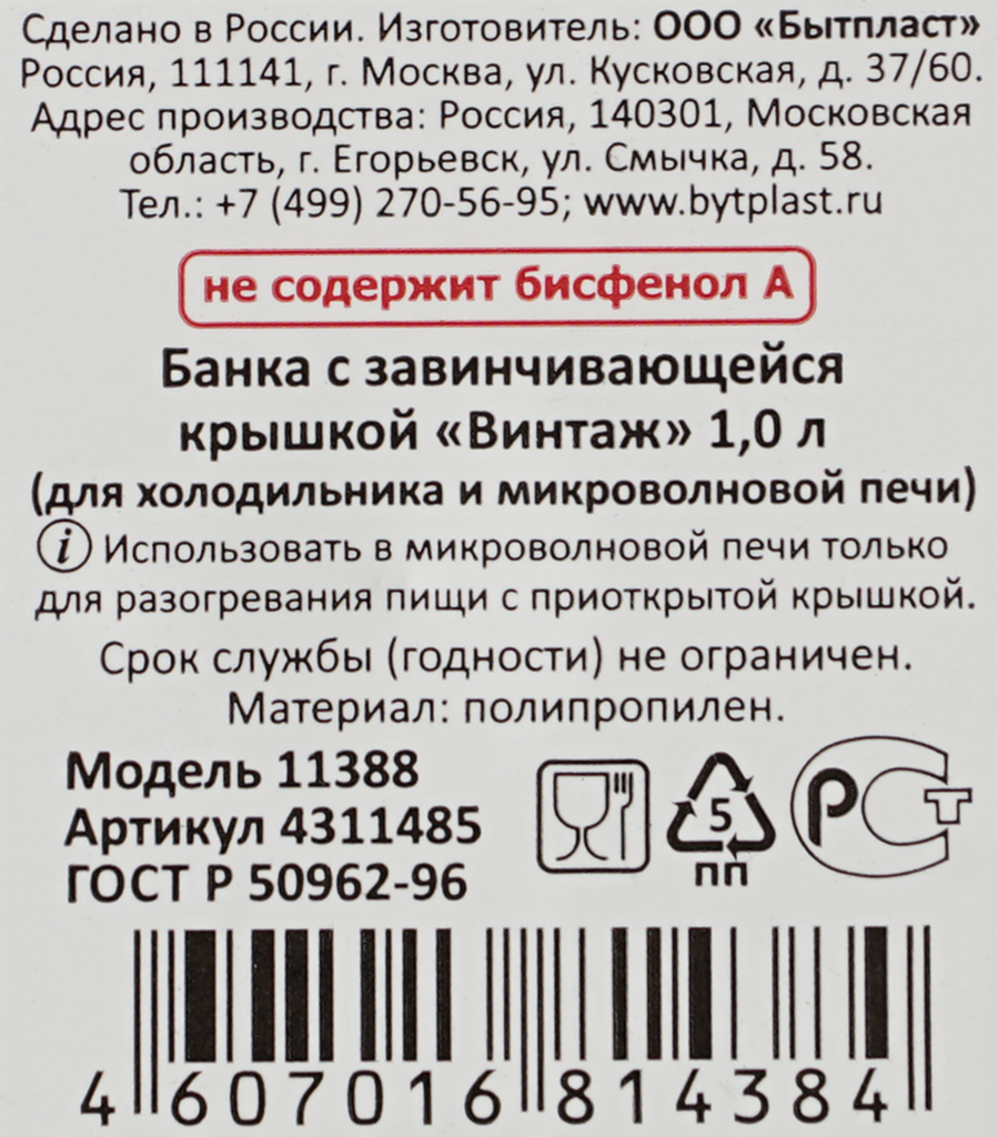 Банка «ВИНТАЖ» имеет винтовую крышку и подходит для хранения, замораживания и разогревания в микроволновой печи (без крышки) различных продуктов и готовых блюд. Плотно прилегающая крышка дополнена окрашенным в яркий цвет эластичным материалом, который надежно предохраняет содержимое от посторонних запахов. Наполненную банку можно перевозить, не опасаясь, что крышка откроется. Прозрачные корпус и крышка позволяют видеть содержимое, а мерная шкала на корпусе поможет определить объем продукта.