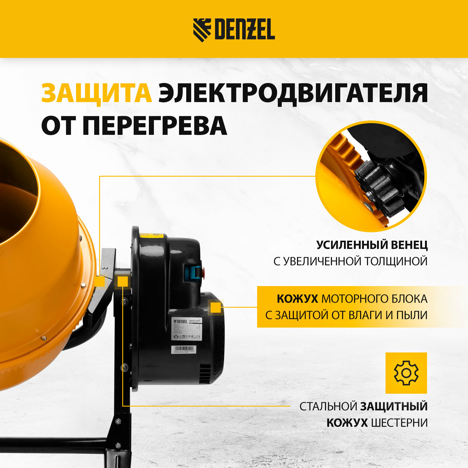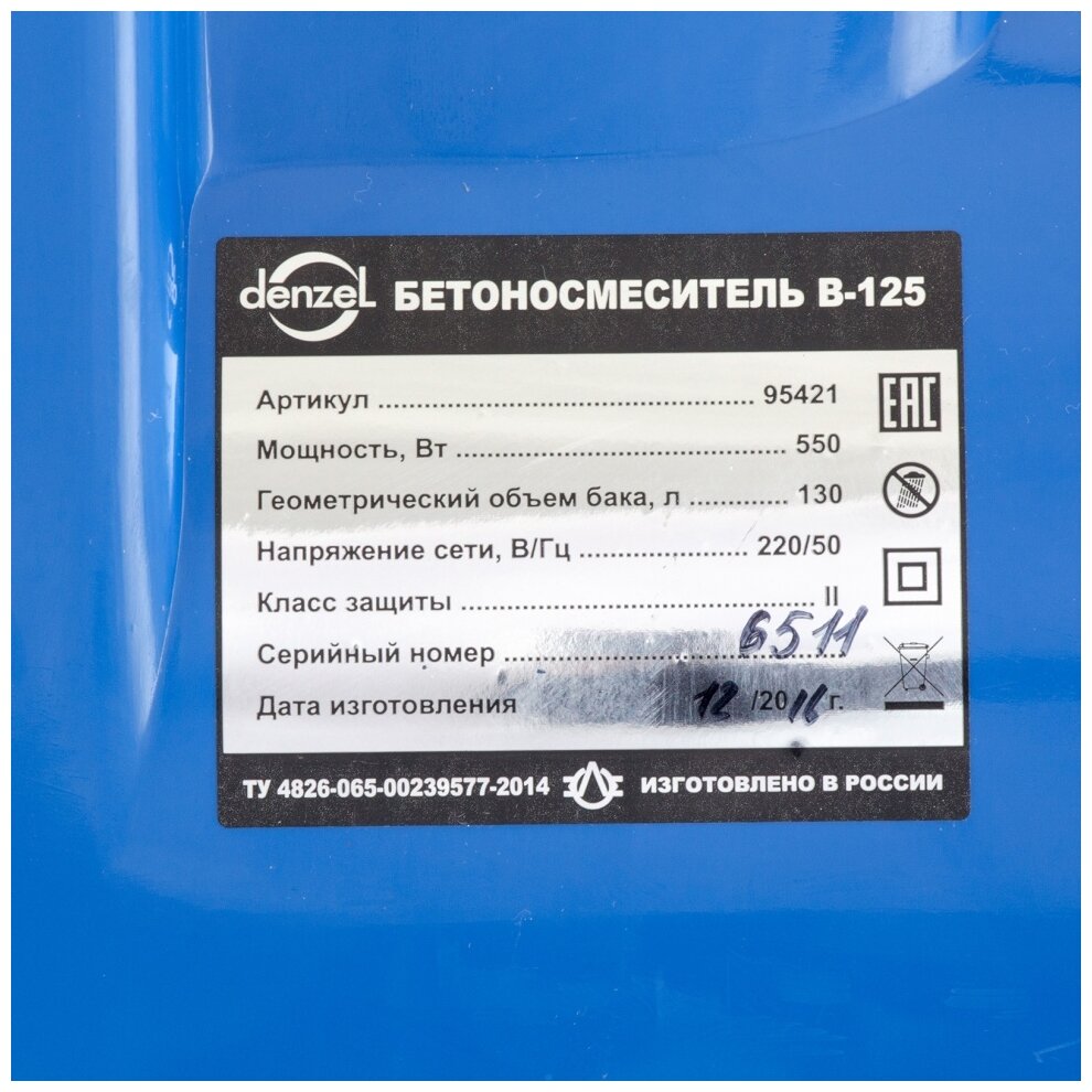 Бетоносмеситель (бетономешалка) торговой марки DENZEL используется для приготовления однородной цементной смеси путем механического смешивания цемента, воды, щебня и песка.Скорость вращения барабана бетономешалки объёмом 125 л составляет 26,6 об/мин.При ПВР (полезное время работы) 30 % такой скорости вращения вполне достаточно для приготовления смеси в выделенный временной интервал. Потребляемая мощность бетономешалки DENZEL при максимальной загрузке барабана составляет 550 Вт.Защитный кожух предотвращает попадание инертных материалов на двигатель. Бетономешалка оборудована чугунным венцом, благодаря которому имеет высокий ресурс.