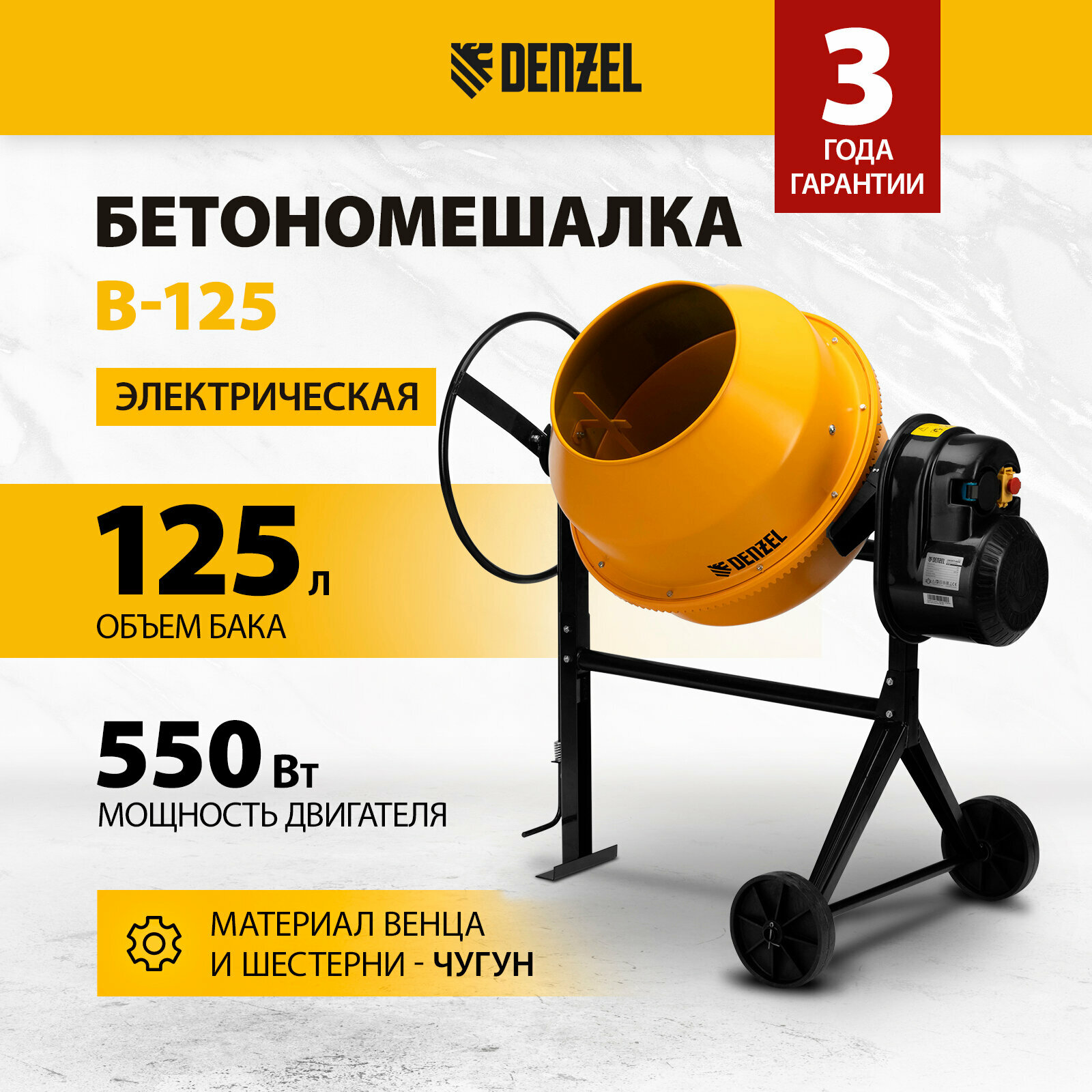 - Бетоносмеситель B 125, 550 Вт, 130 л, DENZEL