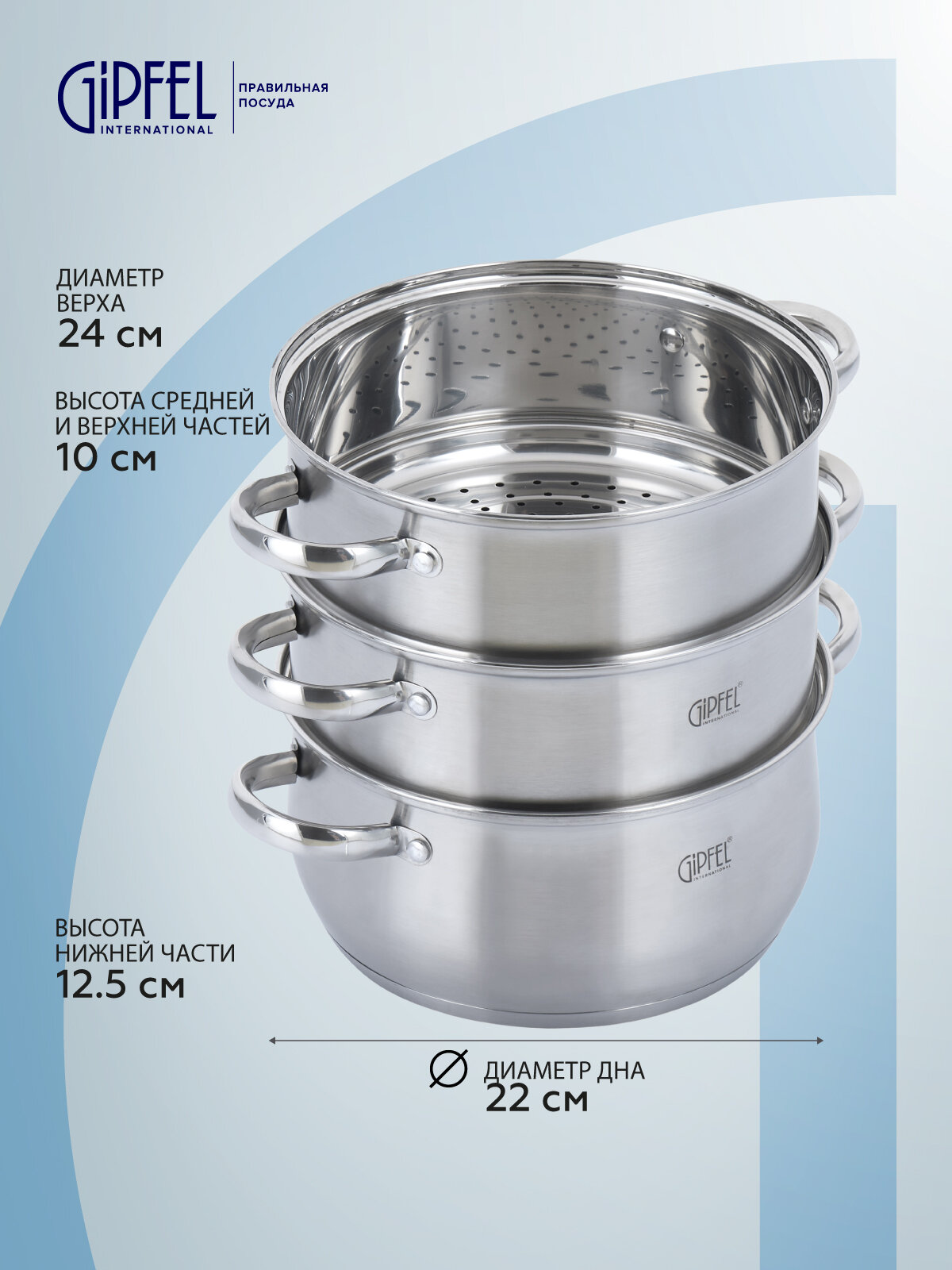 Пароварка двухъярусная GIPFEL SALINA 1309. Объем 5 л. Изготовлена из нержавеющей стали 18/10. У пароварки индукционное дно размером 21,5 см. Размер кастрюли под воду 24х12,5 см. Размер ярусов 24х10 см.