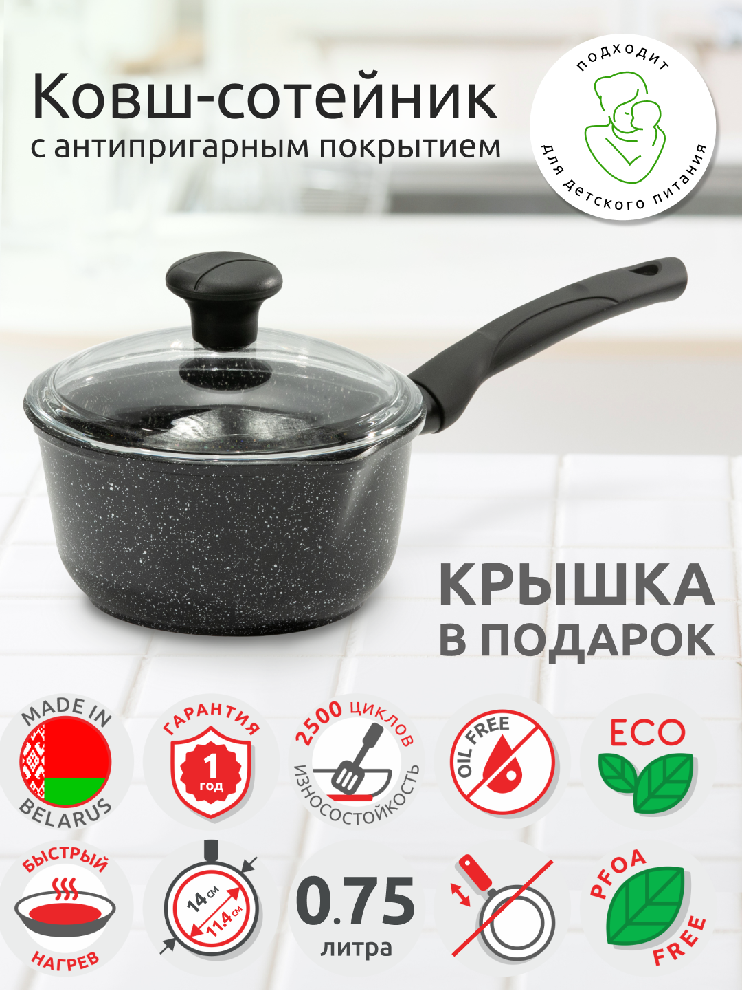 Ковш отлично подойдет для таких задач, как приготовление еды на одну порцию или же для приготовления детского питания. Малые габариты и вес ковша Гранит позволят сэкономить пространство на плите и не потребуют лишних усилий при готовке. Литой толстостенный корпус обеспечит равномерное нагревание и гарантирует долговечность посуде. Ковш из литого высококачественного пищевого алюминия станет незаменимым инструментом и надежным помощником на вашей кухне. Сверхпрочное антипригарное покрытие отличается особой износостойкостью и превосходными антипригарными свойствами, рассчитано на интенсивное использование в течении длительного срока. Толщина покрытия до 50 мкр. Позволяет готовить с минимальным количеством масла, сохраняя вкусовые и полезные свойства продуктов. Гарантия 1 год.