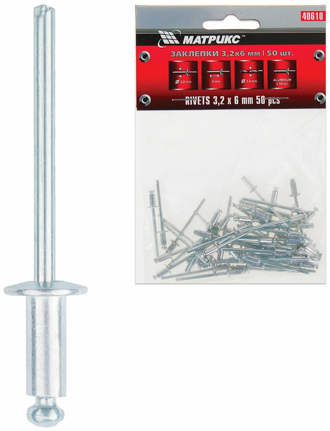 Заклепки, 3,2 х 6 мм, 50 шт,// MATRIX отлично подходят для соединения двух материалов при помощи электрозаклепочника. Соединяет очень прочно и качественно. Благодаря оптимальному количеству, хватит на все нужды.