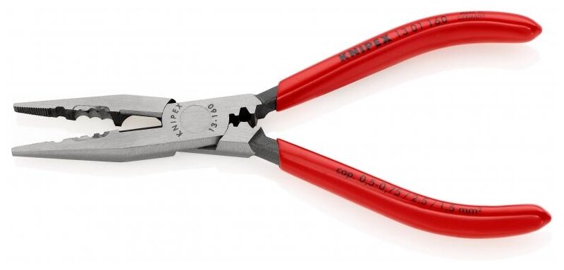 Плоскогубцы для электрика.Идеальные плоскогубцы для работ по прокладке кабельной сети. Для захвата и изгибания различной проволоки.Для резания мягкой, среднетвердой(до 2.5 мм) и твердой проволоки(1.6 мм). Прецизионные режущие кромки дополнительно закалены токами высокой частоты, твердость режущих кромок примерно 60 HRC. С прецизионными отверстиями для удаления. Для опрессовки контактных гильз. Ванадиевая электросталь; кованая, закалённая в масле.Диаметр кабеля 0,5 - 0,75 / 1,5 / 2,5.Длина инструмента:160мм.