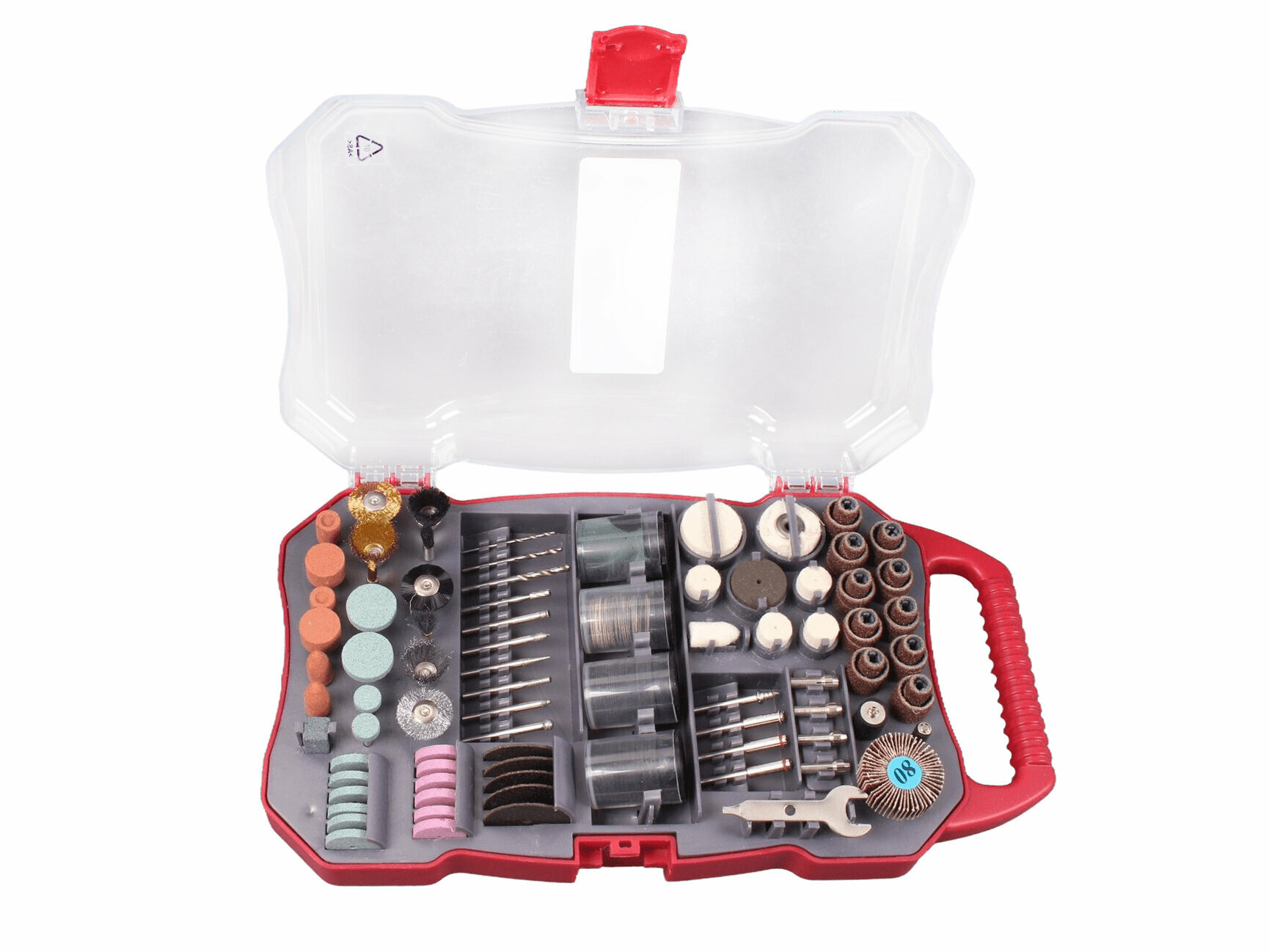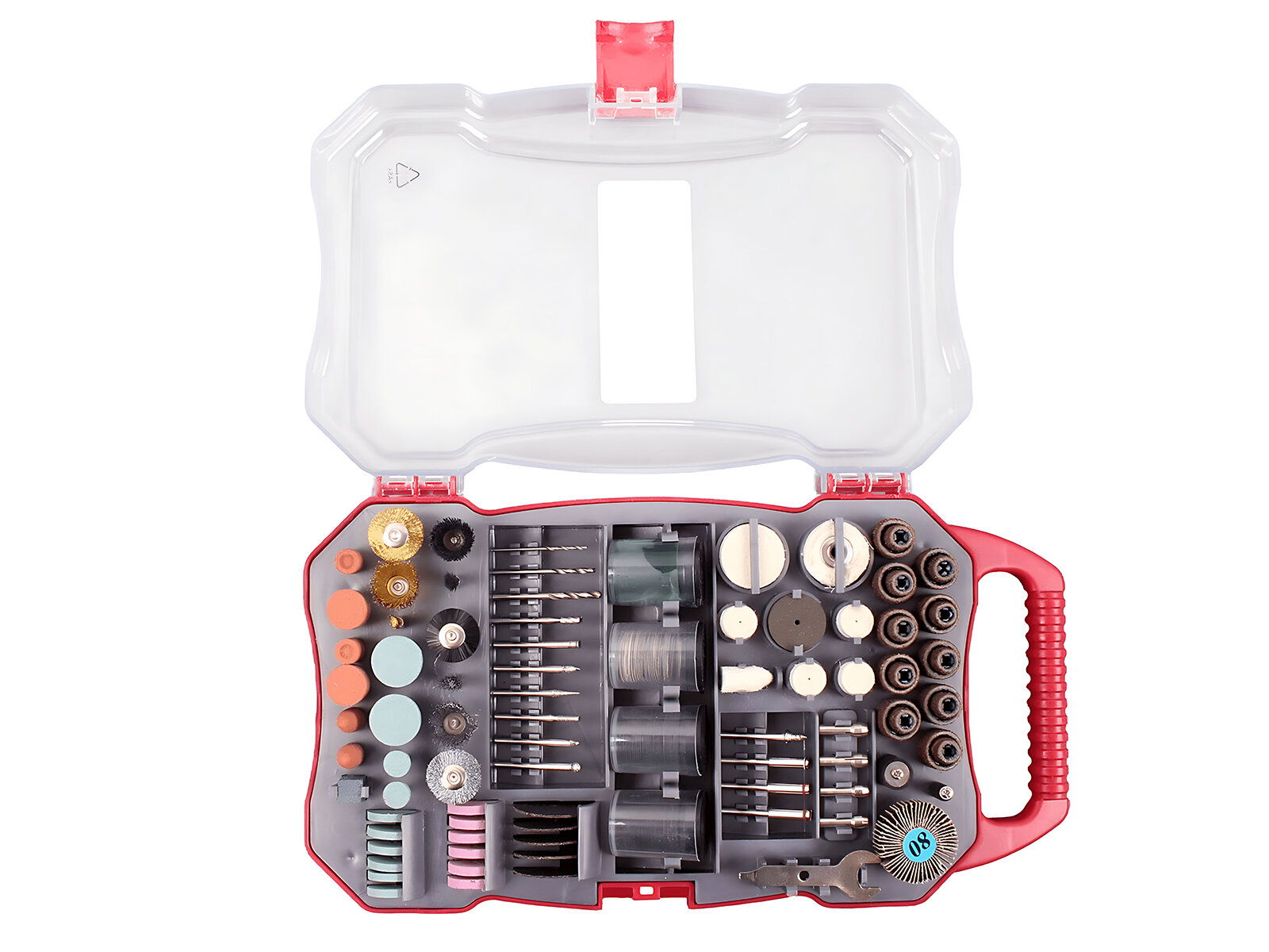 | Состав набора | Щетки-крацовки абразивно-полимерные - 3 шт.,Щетки-крацовки из нержавеющей стали - 3 шт.,Щетки-крацовки из латунированной стали - 3 шт.,Шлифовальные круги - 41 шт.,Ленты абразивные - 20 шт.,Круг лепесмтковый веерный на шпильке (Р80) - 1 шт.,Металлическая шарошка - 1 шт.,Абразивные шарошки по металлу - 22 шт.,Насадка полировальная тканая - 1 шт.,Насадки фетровые - 6 шт.,Резиновая полировальная дисковая насадка - 1 шт.,Отрезные круги по металлу - 76 шт.,Отрезные абразивные круги армированные - 5 шт.,Алмазные шарошки - 6 шт.,Брусок абразивный правочный - 1 шт.,Ключ-отвертка - 1 шт.,Сверло по металлу 1.6х42 мм - 1 шт.,Сверло по металлу 2.4х42 мм - 1 шт.,Сверло по металлу 3.2х48 мм - 1 шт.,Державка для абразивных лент - 2 шт.,Державка для отрезных кругов - 2 шт.,Державка для фетровых насадок - 2шт.,Державка для тканой насадки - 1шт.,Цанги 6 мм - 4 шт. |