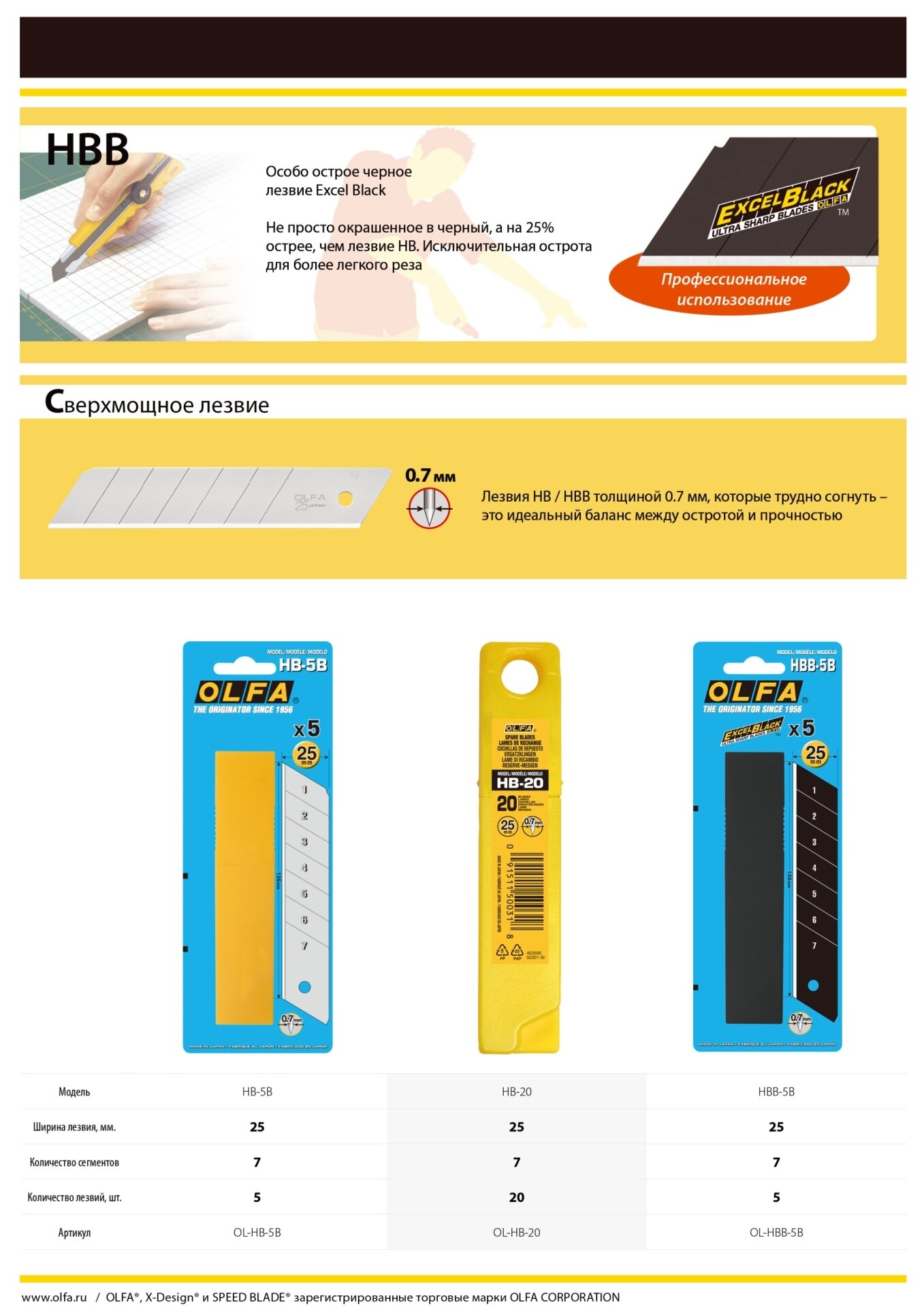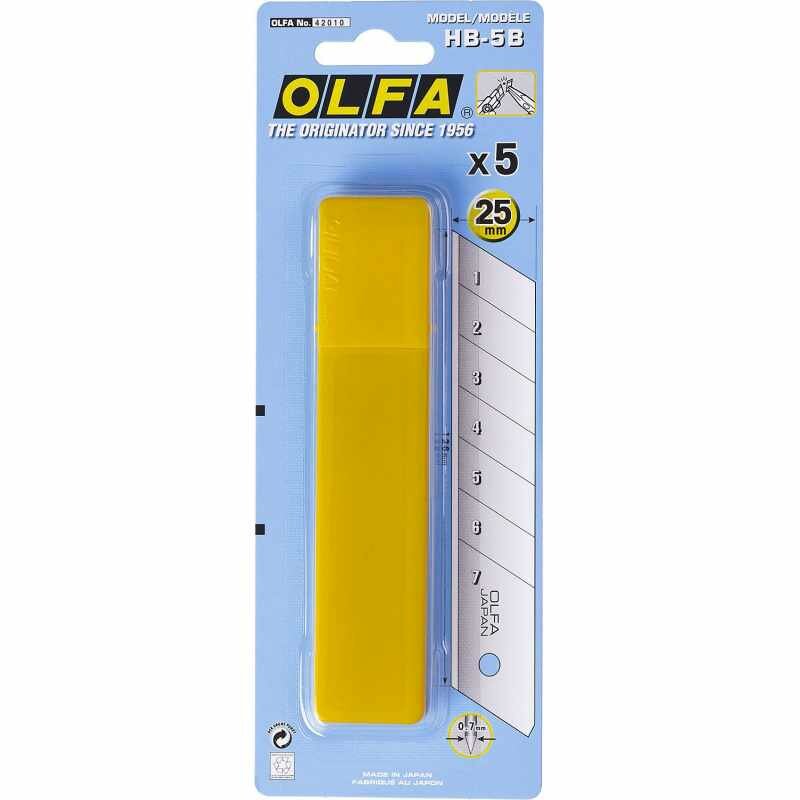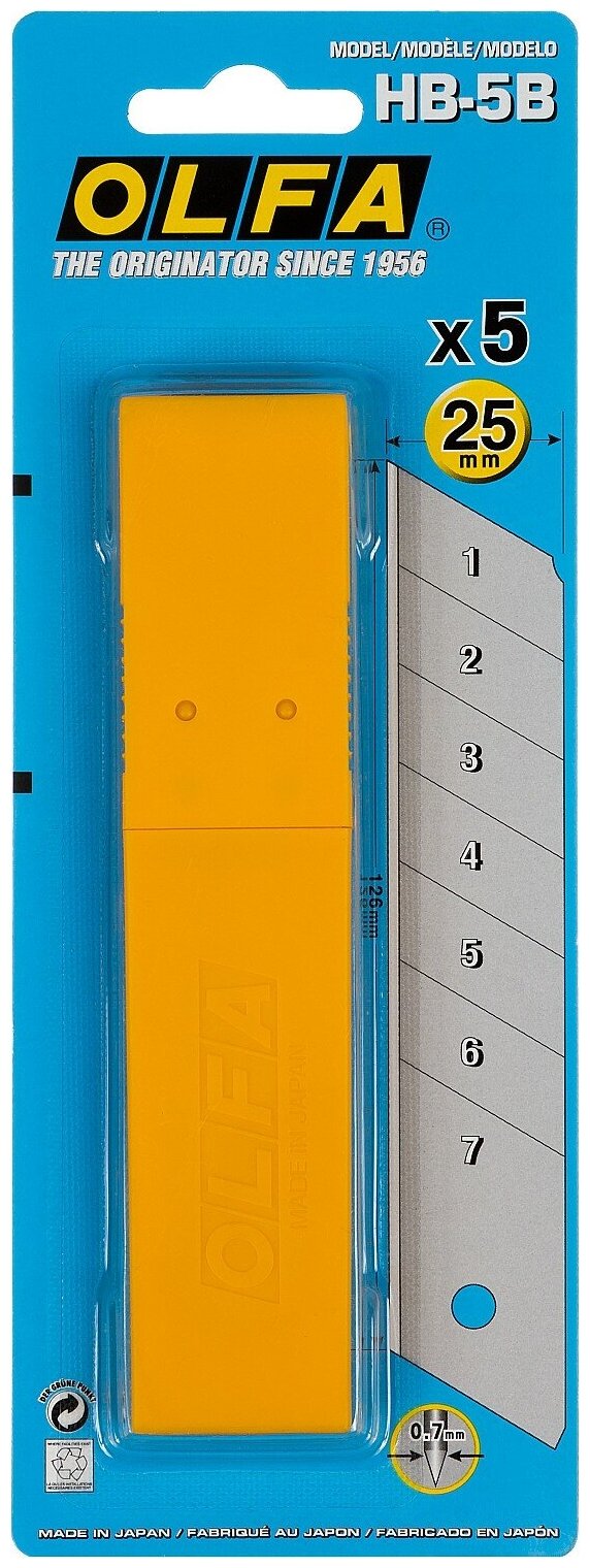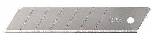 Лезвие OLFA (Олфа) - это сегментированное лезвие (7 сегментов) особой прочности, шириной 25 мм с двойным углом заточки. Лезвие изготовлено по уникальной технологии с ипользованием многошагового процесса доводки и поставляется в упаковке-блистере по 5 лезвий.