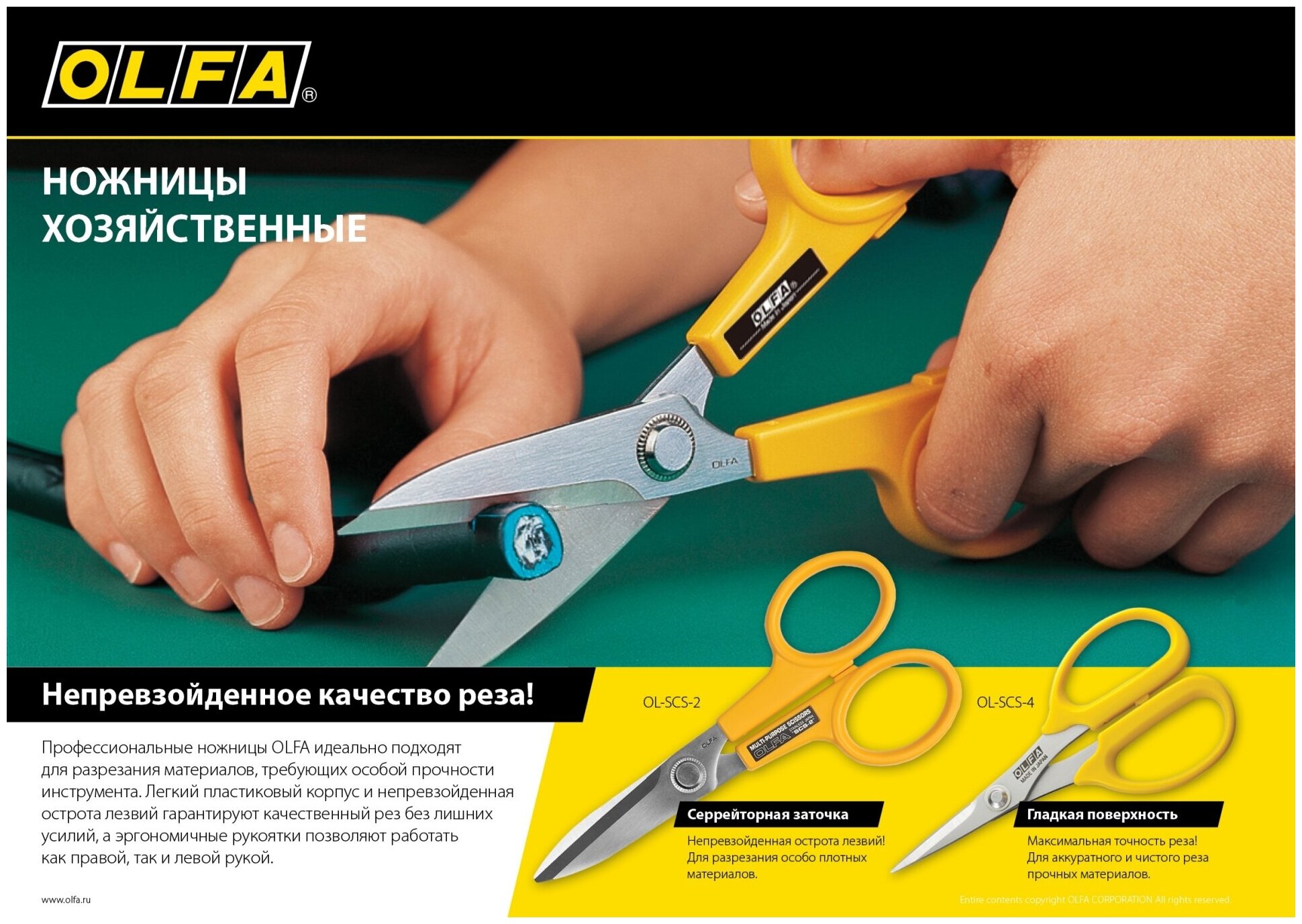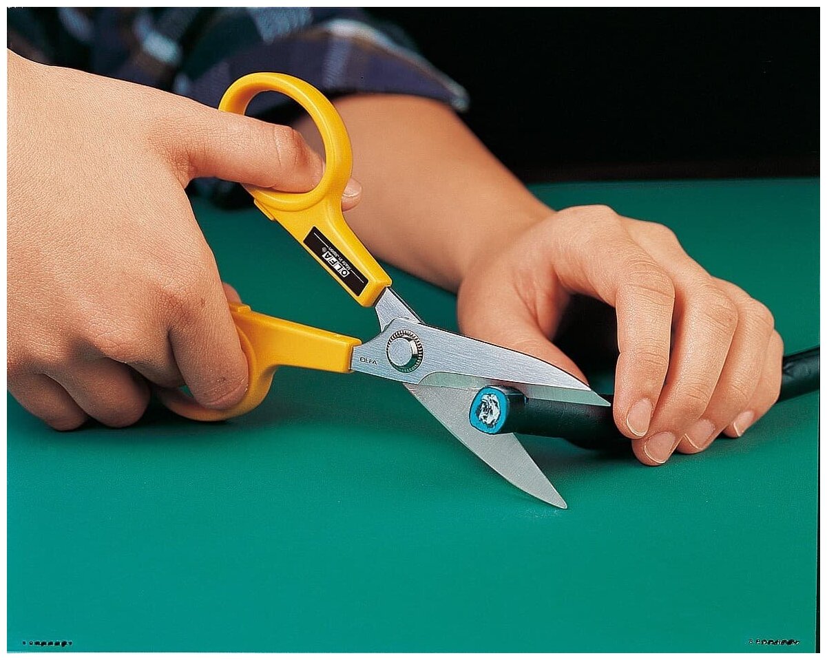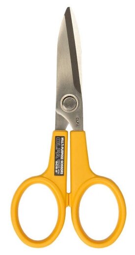 Хозяйственные ножницы OLFA применяются для разрезания различных материалов, таких как картон, кожа, резина, напольные покрытия и других. Лезвия ножниц изготовлены из нержавеющей стали и имеют специальную серрейторную (волнистая форма режущей кромки) заточку, что обеспечивает более точный рез и дает возможность прилагать значительные усилия при выполнении реза., Для резки бумаги, для резки изоляционных материалов, для резки картона, для резки резины, для резки пленки, для резки кожи, для резки ткани