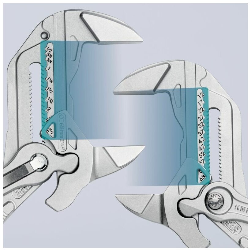| Прочие особенности и свойства | Осевой винт шарнира надежно зафиксирован, что исключает случайную перестановку губок; Малое значение люфта за счет коробчатого шарнира с двумя направляющими; Специальный механизм исключает случайное защемление пальцев; Бесступенчатая регулировка диапазона захвата для более простой и быстрой работы; Зазор между захватными плоскостями обеспечивает работу по принципу трещоточного ключа; Универсальность - 22 позиционная предустановка размера; Возможность работы с хрупкими деталями за счет беззазорного контакта по всей плоскости губок; Возможность работы с деталями шестигранного профиля - до 60 мм (2 3/8") |