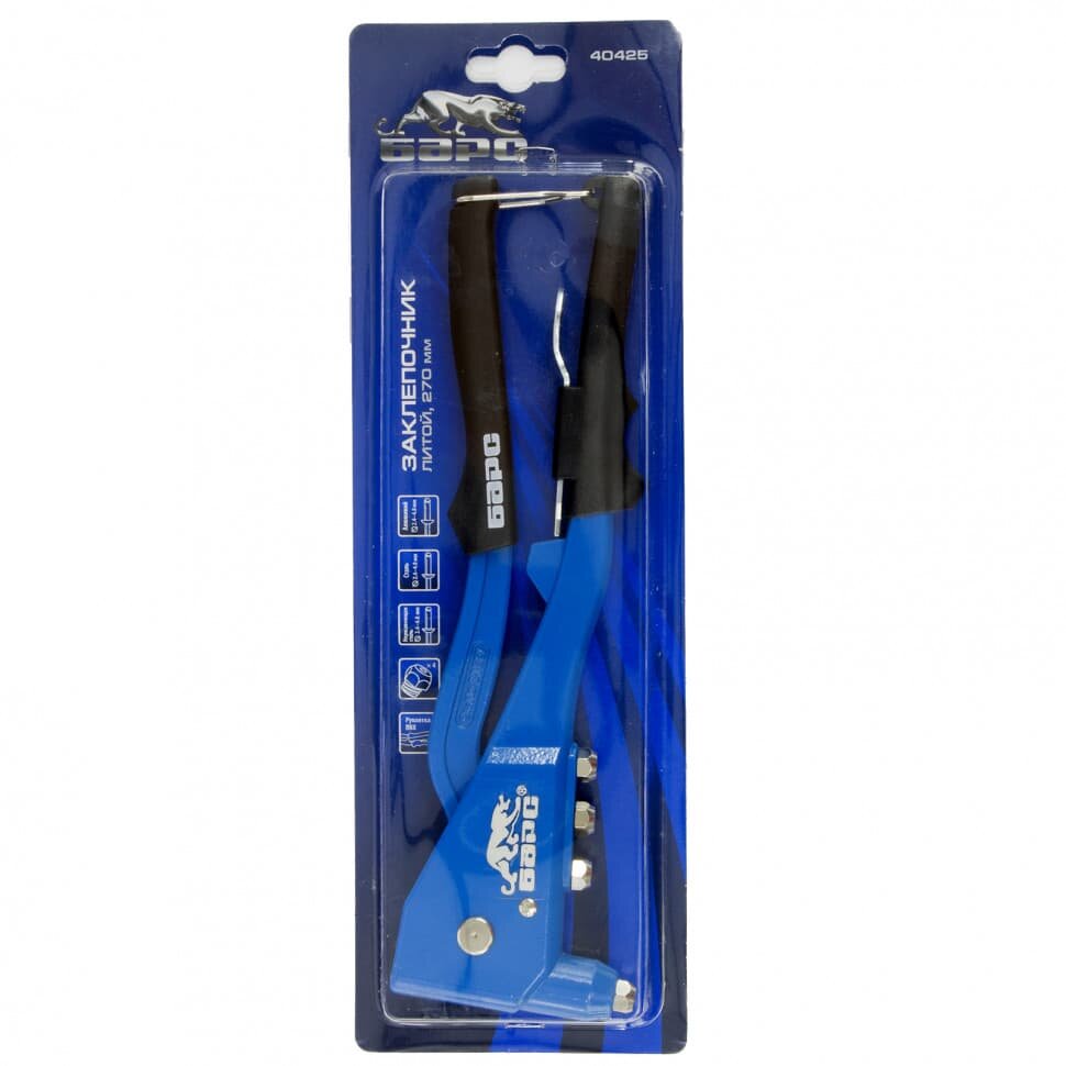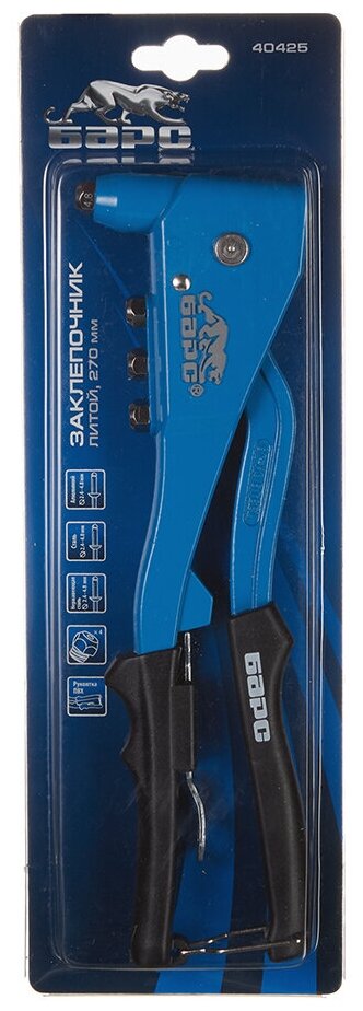 | Прочие особенности и свойства | Литой заклёпочник Барс 40425 длиной 270 мм предназначен для работы с вытяжными заклёпками 2,4-4,8 мм. Помогает соединять листовые металлические заготовки, металлопрофиль и легкие конструкции небольшой толщины. Он находит широкое применение как в быту, так и в профессиональной деятельности при проведении строительных, ремонтных и монтажных работ., , Преимущества, Высокое качество — заклёпочник произведен на высокотехнологичном заводе в Тайване., Долговечность и устойчивость к нагрузкам — литой корпус выполнен из коррозионностойкого алюминиевого сплава, а цанговый зажим — из хромомолибденовой стали (SCM435)., Эргономичные рукоятки и небольшой вес 640 г — нагрузка на руки снижена, поэтому с заклёпочником удобно работать продолжительное время., Полный комплект поставки — к инструменту прилагаются сменные головки для заклёпок из алюминия, стали и «нержавейки» диаметром 2,4-3,2-4,0-4,8 мм, а также ключ для смены насадок. |