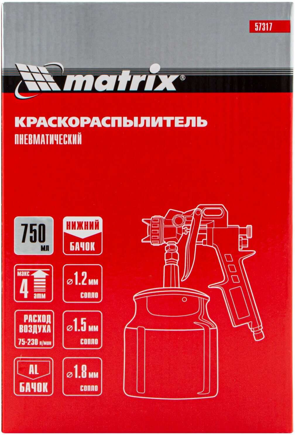 | Описание | Краскораспылитель пневматический с нижним бачком V 0,75 л, сопло D 1.2, 1.5 и 1.8 мм Matrix |