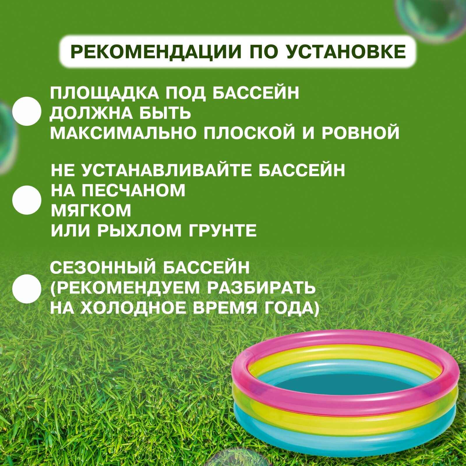 Круглый надувной бассейн для детей от 3 лет. Преимущества: - Изготовлен из высококачественного винила, устойчивый, надежный и безопасный; - 4 надувные камеры; - Имеет мягкие стенки с широкими бортиками и жесткое дно из ПВХ-пленки; - Бассейн легко надувается и устанавливается на любой ровной поверхности; - В комплект входит сверхпрочная ремонтная заплата. На холодное время года не рекомендуется оставлять бассейн на открытом воздухе.