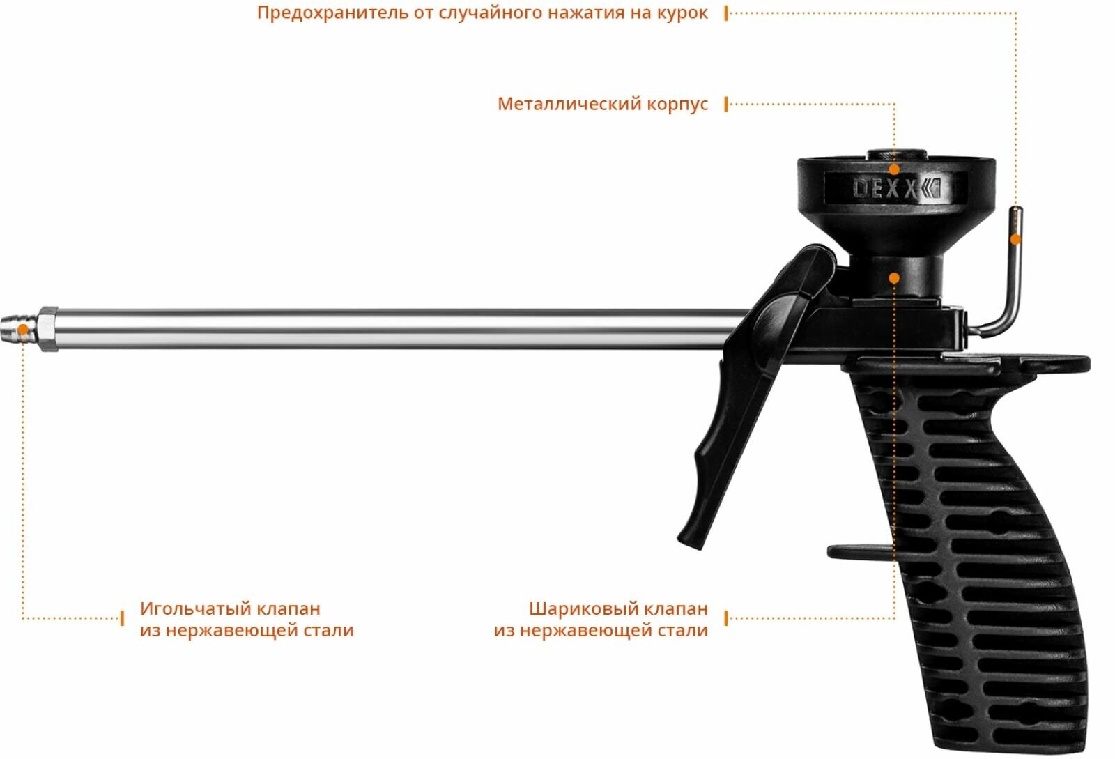 Пистолет для монтажной пены DEXX — это инструмент с пластмассовым корпусом, который идеально подходит для заполнения пустот при монтажных, отделочных и ремонтных работах. Преимущества Пластмассовый корпус: пистолет изготовлен из прочного пластика, устойчивого к воздействию химических веществ, что обеспечивает долгий срок службы инструмента. Удобная рукоятка: рукоятка с упором обеспечивает комфортное удержание пистолета в руке, снижая утомляемость оператора во время работы. Металлический ствол и игольчатый клапан: эти элементы изготовлены из высококачественных материалов, что гарантирует надёжность и долговечность инструмента. Компактная конструкция: пистолет имеет небольшие размеры и вес, что делает его удобным для работы в труднодоступных местах и облегчает хранение.