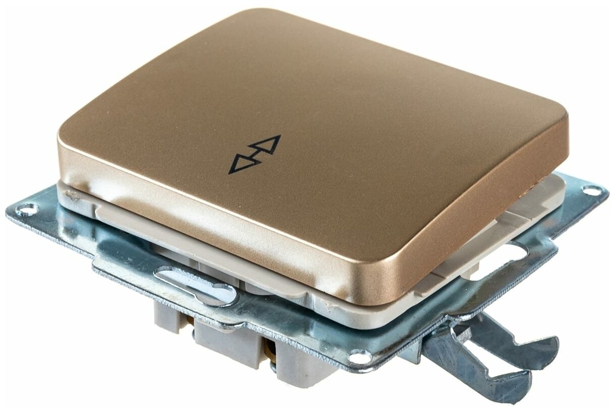 Проходной одноклавишный выключатель СВЕТОЗАР гамма, подключается к проводам и устанавливается в монтажную коробкудиаметром 60 мм или 68 мм. Выключатель имеет эффектное цветовое оформление под золотой металлик и выгодно смотрится в помещениях даже с самым изысканным интерьером. Изделие можно использовать как дома, так и в офисе.ПреимуществаВысококачественный ABS-пластик.Керамическое пожаробезопасное основание.Надежное подключение проводов.Широкая цветовая гаммаКлассический дизайнИспользованиевключения/выключения света в жилых и нежилых помещениях.