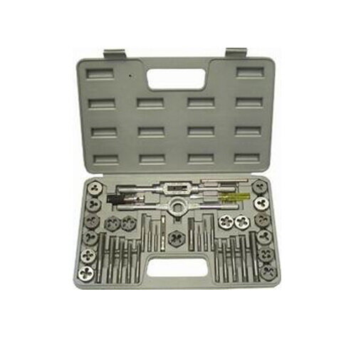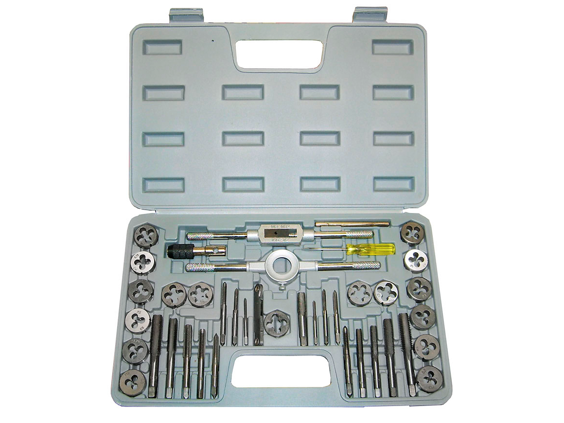 Комплектация: метчикодержатель, плашкодержатель, резьбомер,16 метчиков и 16плашек: 3х0,5; 3х0,6; 4х0,7; 4х0,75; 5х0,8; 5х0,9; 6х0,7; 6х1,0; 7х0,75; 7х1,0; 8х1,0; 8х1,25; 10х1,25;10х1,25; 12х1,5; 12х1,75мм. Материал: легированная инструментальная сталь