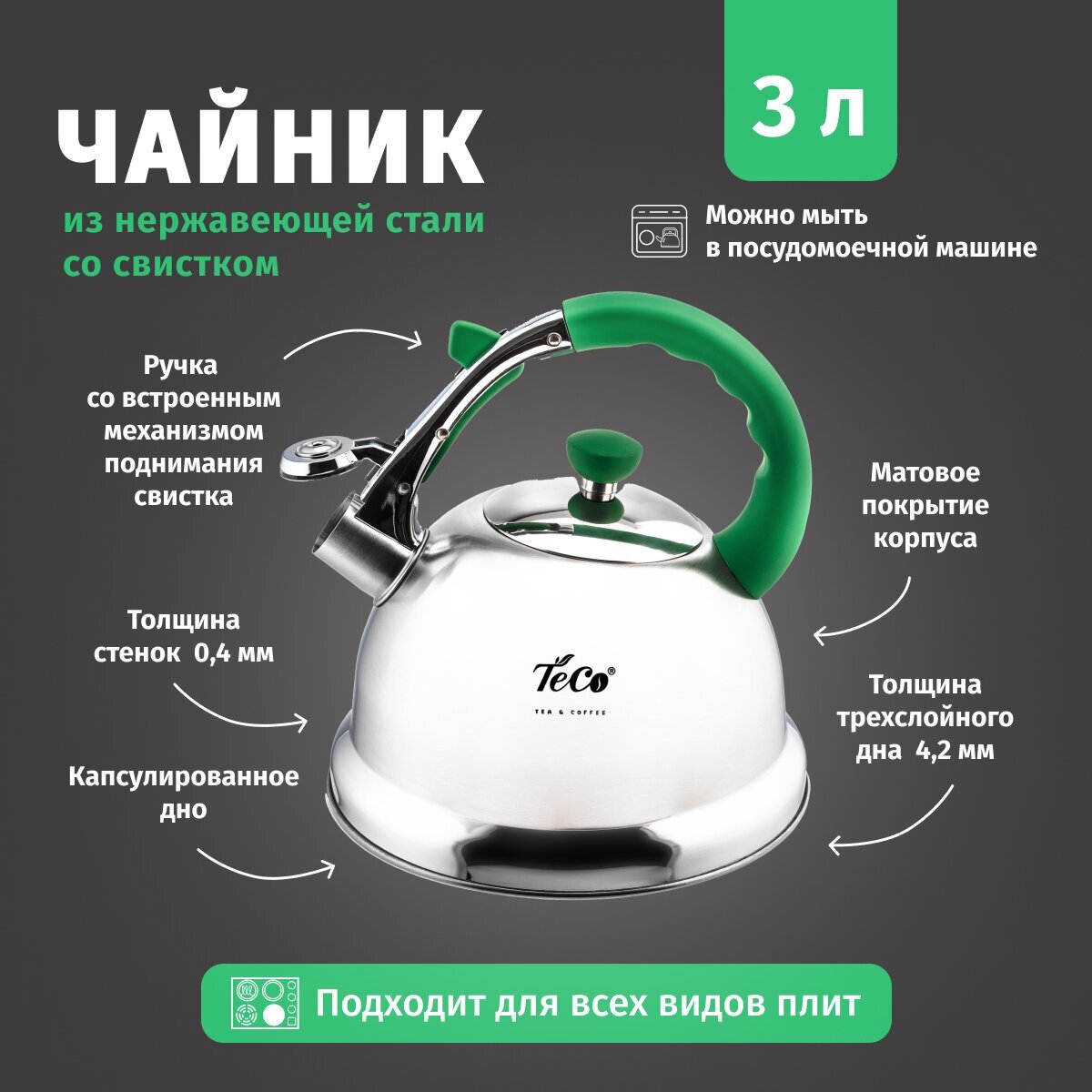 Чайник Teco серебристый 3 л нержавеющая сталь силиконовая цветная ручка