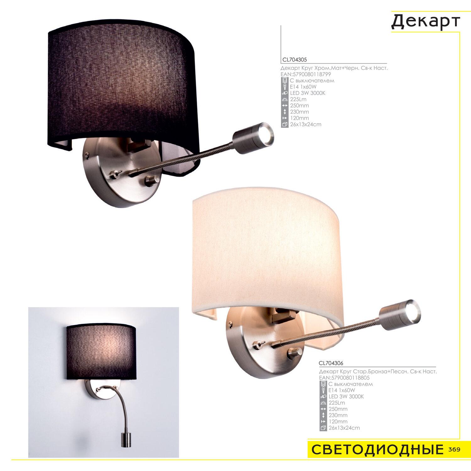 Настенный светильник с абажуром Citilux Декарт CL704305, с дополнительной подсветкой для чтения на гибкой ножке. В модели два источника света, каждый включается индивидуально. Управление основным светом осуществляется плавным регулятором яркости (диммер) со встроенным выключателем. В качестве источника света используется лампа с цоколем Е14 и мощностью до 60Вт для ламп накаливания или светодиодные (LED) диммируемые лампы с плавной регулировкой (важно! Обычные светодиодные лампы или лампы со ступенчатым диммером не подходят). Подсветка поворотная со встроенным светодиодом для акцентного, направленного освещения мощностью 3Вт с выключателем. Основание светильника металлическое, круглой формы, цвет матовый хром. Тип крепления – планка. Абажур тканевый полукруглый, текстура материала «рогожка», цвет черный.