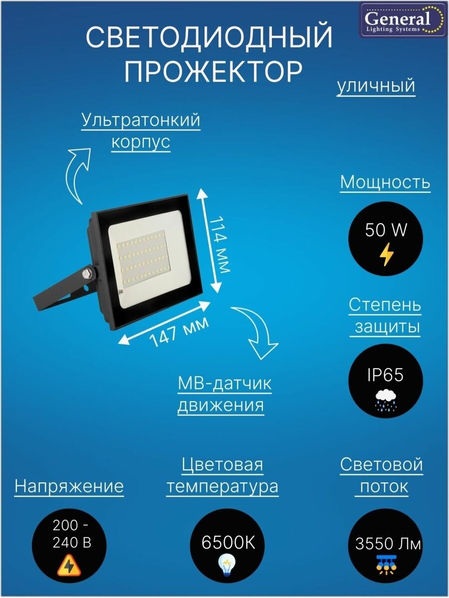 Прожектор светодиодный с датчиком движения General 50W (4150lm) SMD 6500K 237x185x37 (размер: 237x185x47)