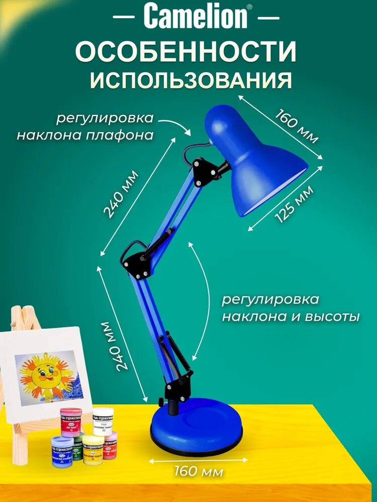 Светильники настольные Camelion имеют современный стильный дизайн, прост в установке и эксплуатации, изготовлены из негорючих и нетоксичных материалов и отвечают всем современным нормам комфорта и безопасности. Настольный светильник Camelion KD-313 предназначен для освещения рабочего пространства на письменном столе, создания комфортных условий на рабочем месте. Светильник имеет интересный дизайн.