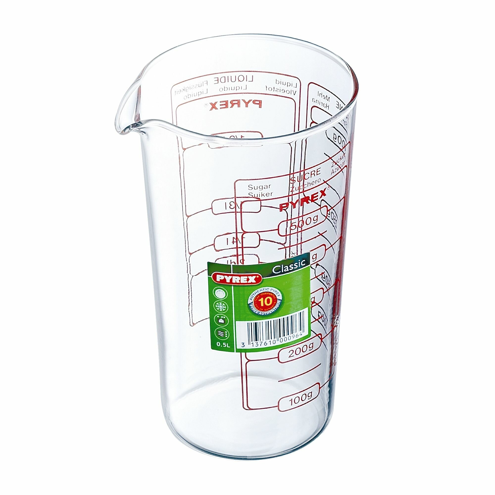 Мерный стакан PYREX Classic 0,5 л, d-9 см, 10x10x17 см. С помощью мерного стакана удобно измерять небольшое количество ингредиентов во время приготовления первых и вторых блюд, десертов и выпечки. Мерная шкала позволяет точно отмерить сухие и жидкие ингредиенты в миллилитрах и граммах. Красная измерительная шкала для лучшей читаемости и более точной дозировки. Нескользящая ручка для надежного захвата. Низкоэмиссионный, не содержащий BPA и гигиеничный материал, не впитывающий грязь и запахи. Боросиликатное стекло устойчиво к царапинам, можно мыть в посудомоечной машине. Очень удобный, практичный и стильный аксессуар станет незаменимым помощником на кухне.