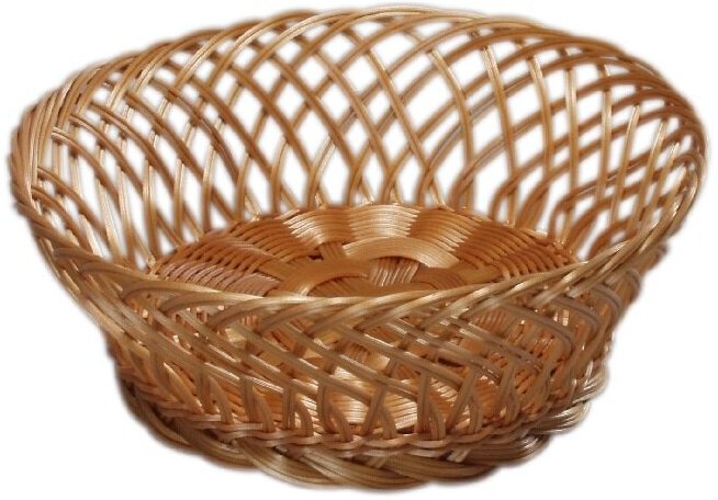 Оригинальная плетеная корзинка круглой формы, выполнена из пластика, напоминающего фактуру дерева. Корзинка прекрасно подойдет для вашей кухни. Она предназначена для красивой сервировки фруктов, хлеба.