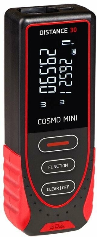 | Прочие особенности | Лазерная рулетка ADA COSMO MINI новая компактная и удобная модель лазерного дальномера. Это младшая модель в специальной серии COSMO с минимальным набором функций для измерений и расчетов.,,Точность и дальность. Лазерная рулетка ADA COSMO Mini предназначена для измерений дистанций до 30 метров внутри помещений и на улице. Погрешность измерения ±3,0 мм.,,Простое управление. Все измерения производятся при помощи всего трех кнопок. Первая — измерение, она же включение и переход в непрерывный режим, вторая кнопка для выбора функций:измерение площади, объема, измерения «по Пифагору». Третья - отмена и выключение.,,Оптимальный набор функций. Несмотря на кажущуюся простоту и малые размеры ADA COSMO Mini выполняет самые необходимые функции. ADA COSMO Mini может рассчитать площадь, объем. Недоступные величины (измерение высоких объектов или через препятствие) можно измерить «по Пифагору».,,Автоматическое выключение. Для экономии заряда батарей через 60 сек автоматически выключается подсветка экрана (при бездействии). По прошествии 180 сек дальномер выключится полностью.,,Легко читаемая индикация. 2-строчный дисплей с постоянной подсветкой удобен при работе в любое время суток при любом освещении. В нижней строке крупными цифрами отображается полученный результат. В верхней цифрами меньшего размера выводится предыдущее значение.,,Небольшой и удобный. Благодаря своей эргономичной и компактной конструкции с резиновыми протекторными накладками, ADA COSMO Mini надежно сидит в руке. Прибор легкий всего 120 грамм, умещается в любой карман. Повышенная защита от ударов при падении. Защита от брызг воды и пыли IP54.,,Выбор точки отсчета. По умолчанию ADA COSMO MINI производит измерения от его нижней поверхности. На клавишной панели, нажимая кнопку FUNCTION более 2 секунд можно выбрать точку отсчета:верхнюю или нижняя часть дальномера. Выбранная точка отсчета измерений отображается значком на экране прибора.,,Выбор единиц измерения (ft/m). На выключенном приборе нажмите и удерживайте более 4 секунд клавишу включения(1). Выбранные единицы измерения (ft/m) отобразятся на дисплее. При последующем включении, если менять единицы измерения не планируется, при включении не нажимайте на клавишу включения более 4 секунд.,,Лазерная рулетка ADA COSMO MINI отличный выбор для работ внутри помещений и на улице. Заменит обычную рулетку мастеру отделочнику, столяру, постановщику окон, дизайнеру. Компактный и легкий дальномер для стройплощадки и дома. |