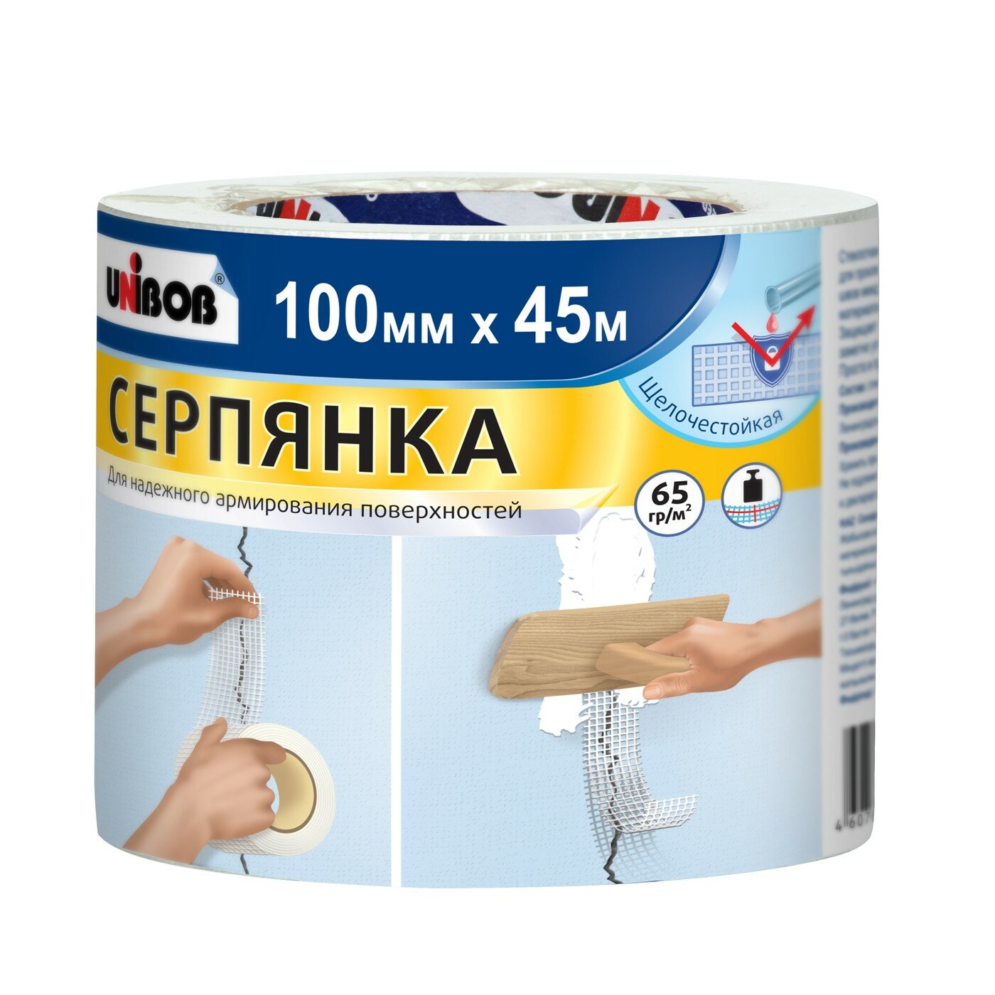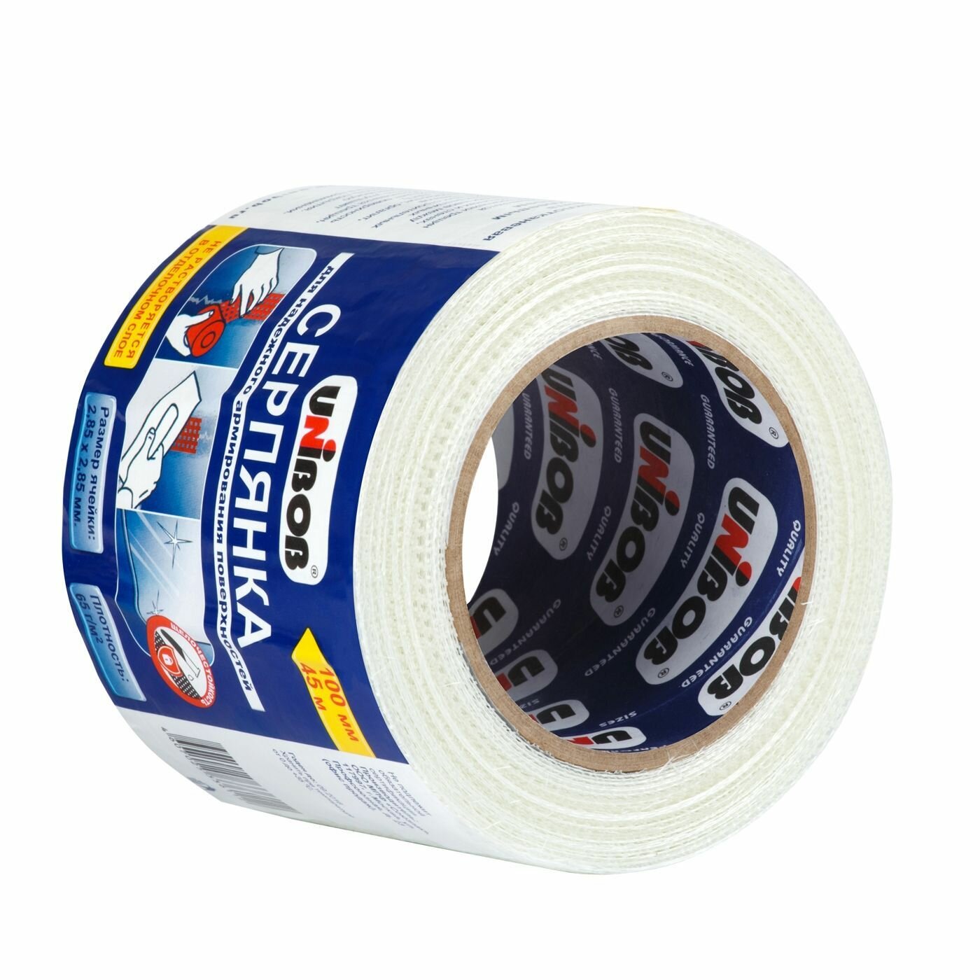 Серпянка Unibob щелочестойкая 100 мм х 45 м — рулонный материал, защищает поверхности от воздействия щелочей и других агрессивных веществ, предотвращает появление трещин.
